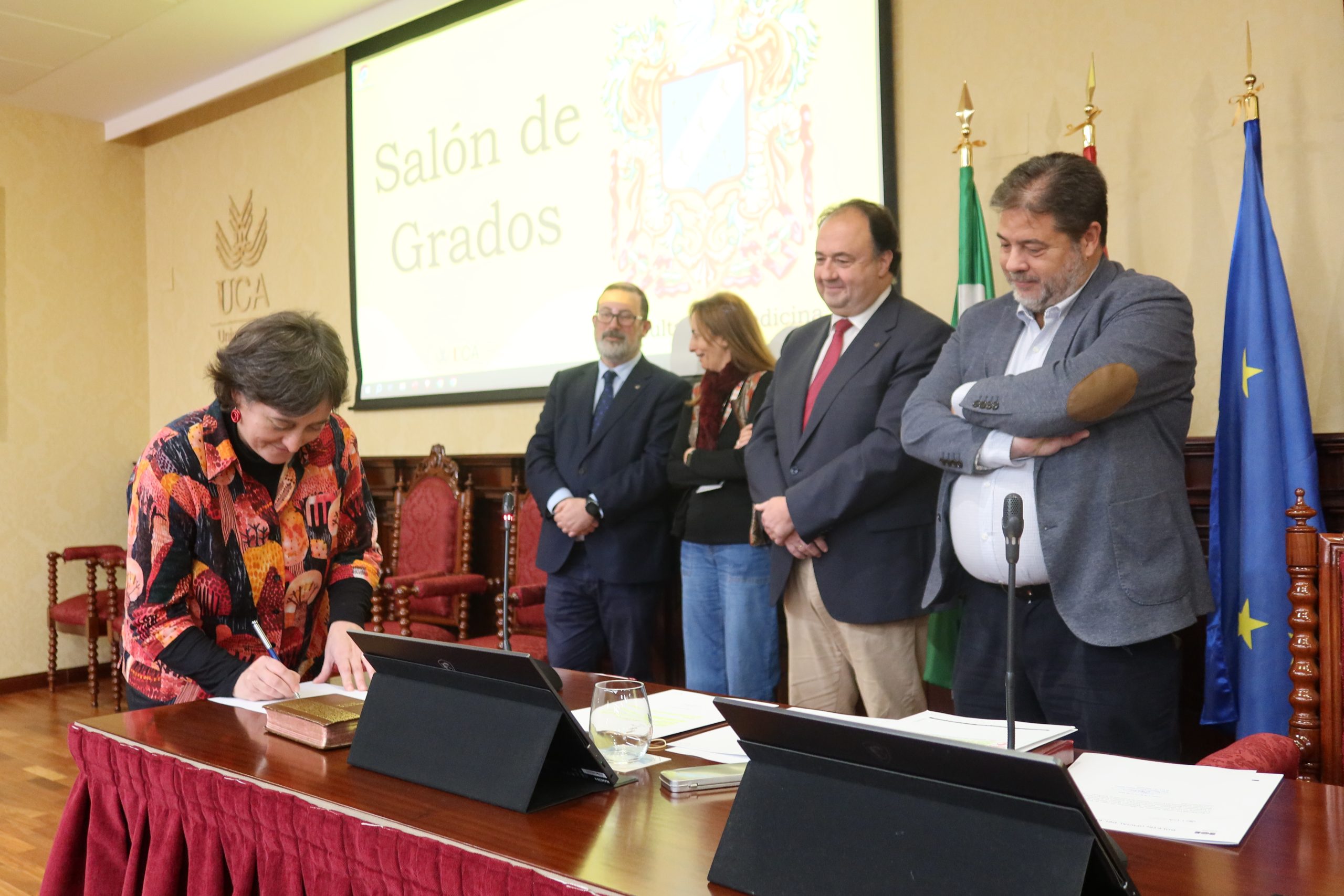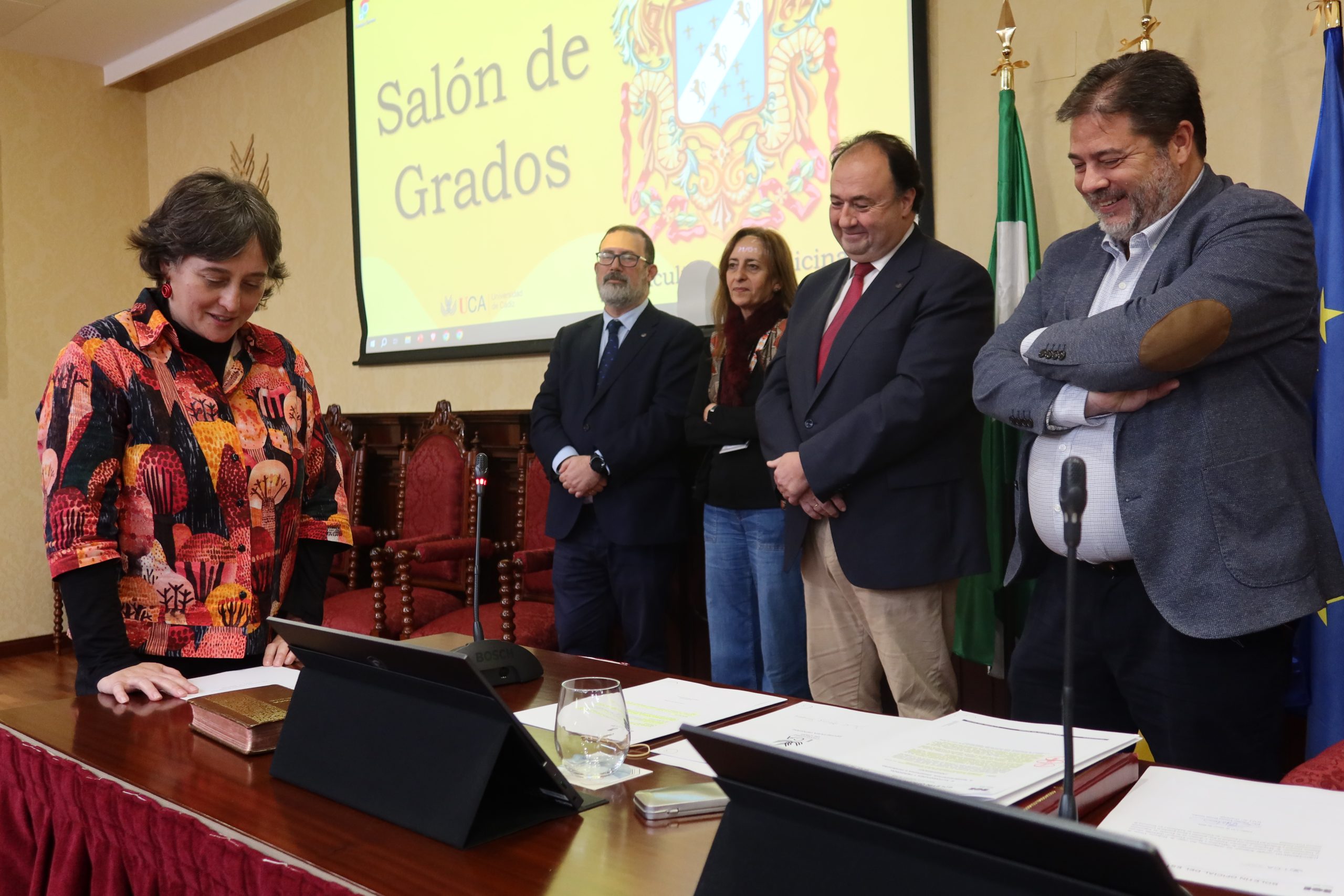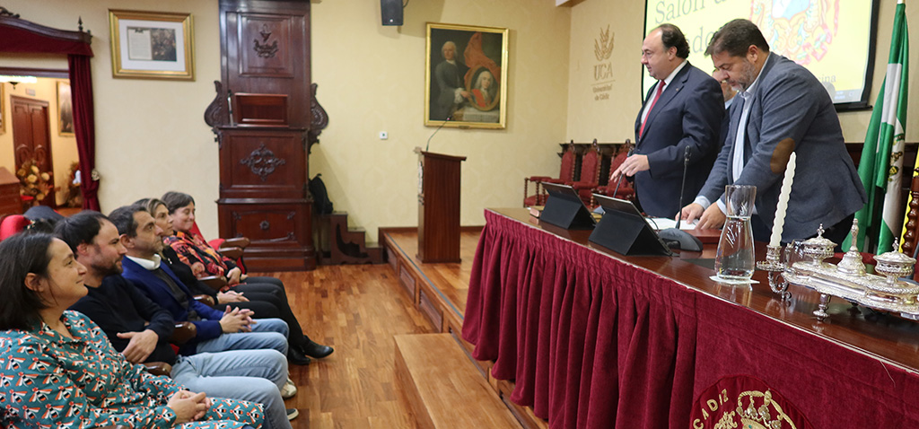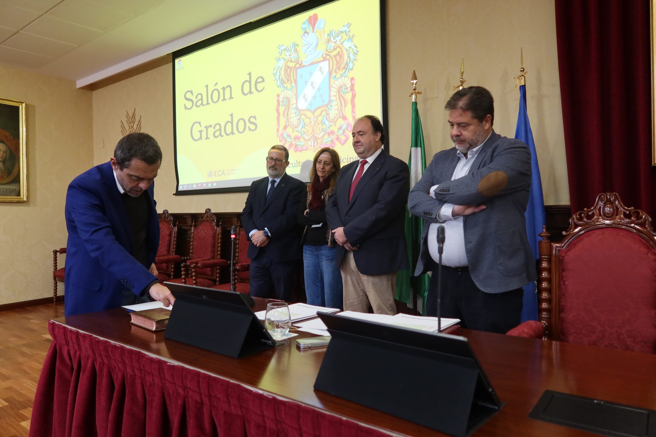 El rector de la Universidad de Cádiz, Casimiro Mantell, junto con el secretario General de la UCA, Manuel Rozados, en compañía de los vicerrectores de Profesorado e Investigación y Transferencia, José Antonio Perales y Mª Jesús Ortega, respectivamente, ha presidido hoy, en la Facultad de Medicina en el Campus de Cádiz, la toma de posesión de cuatro profesores titulares y una directora de departamento.