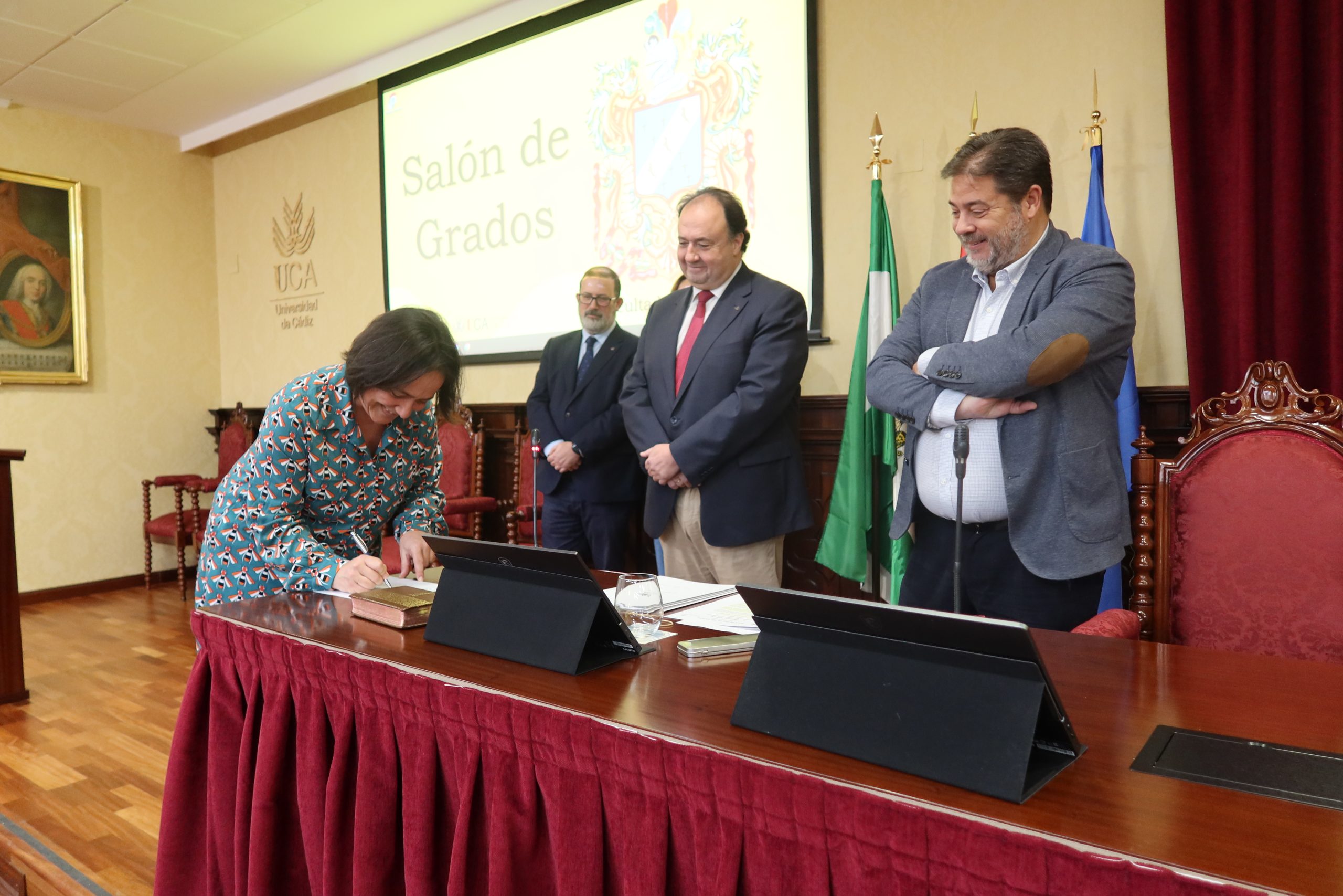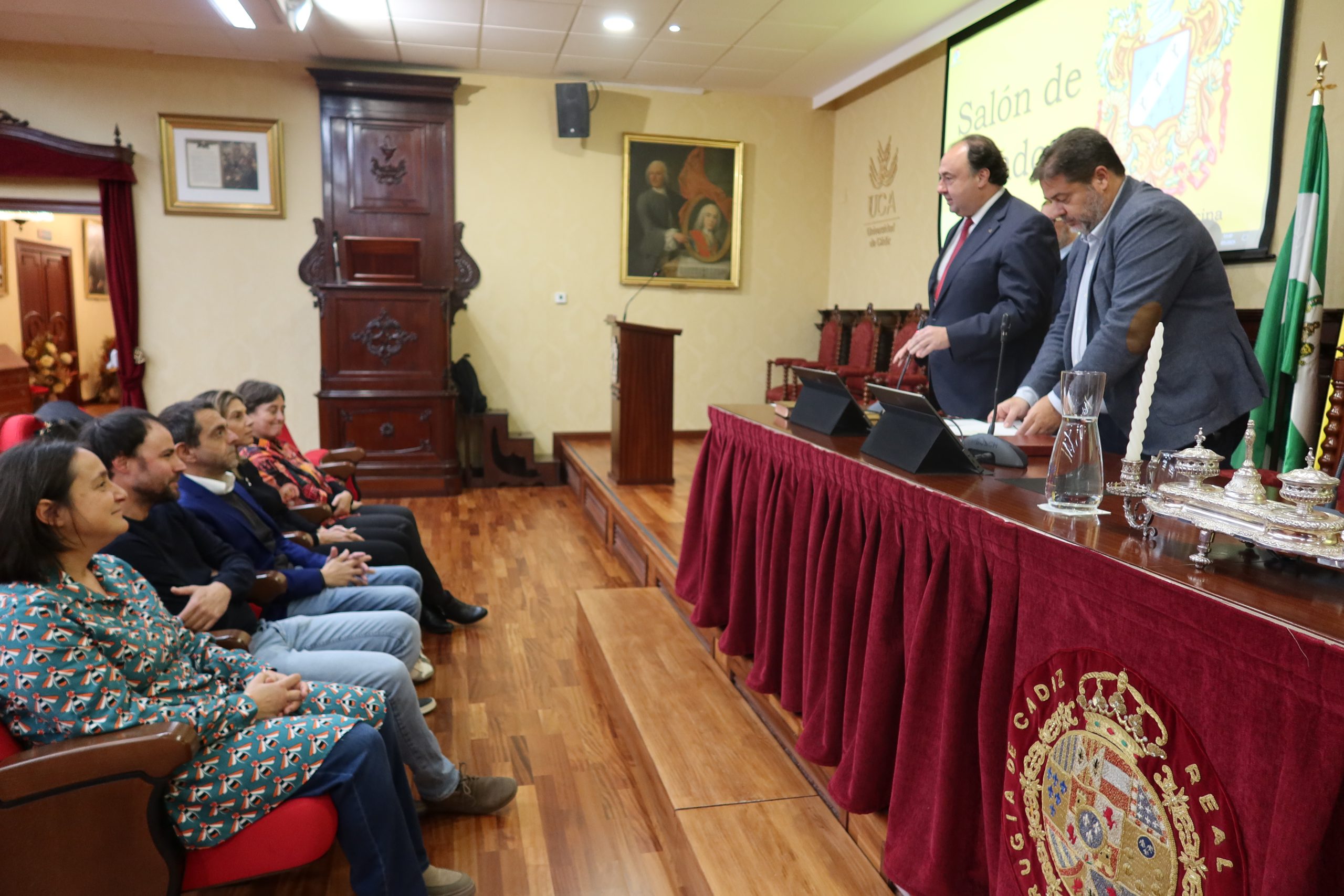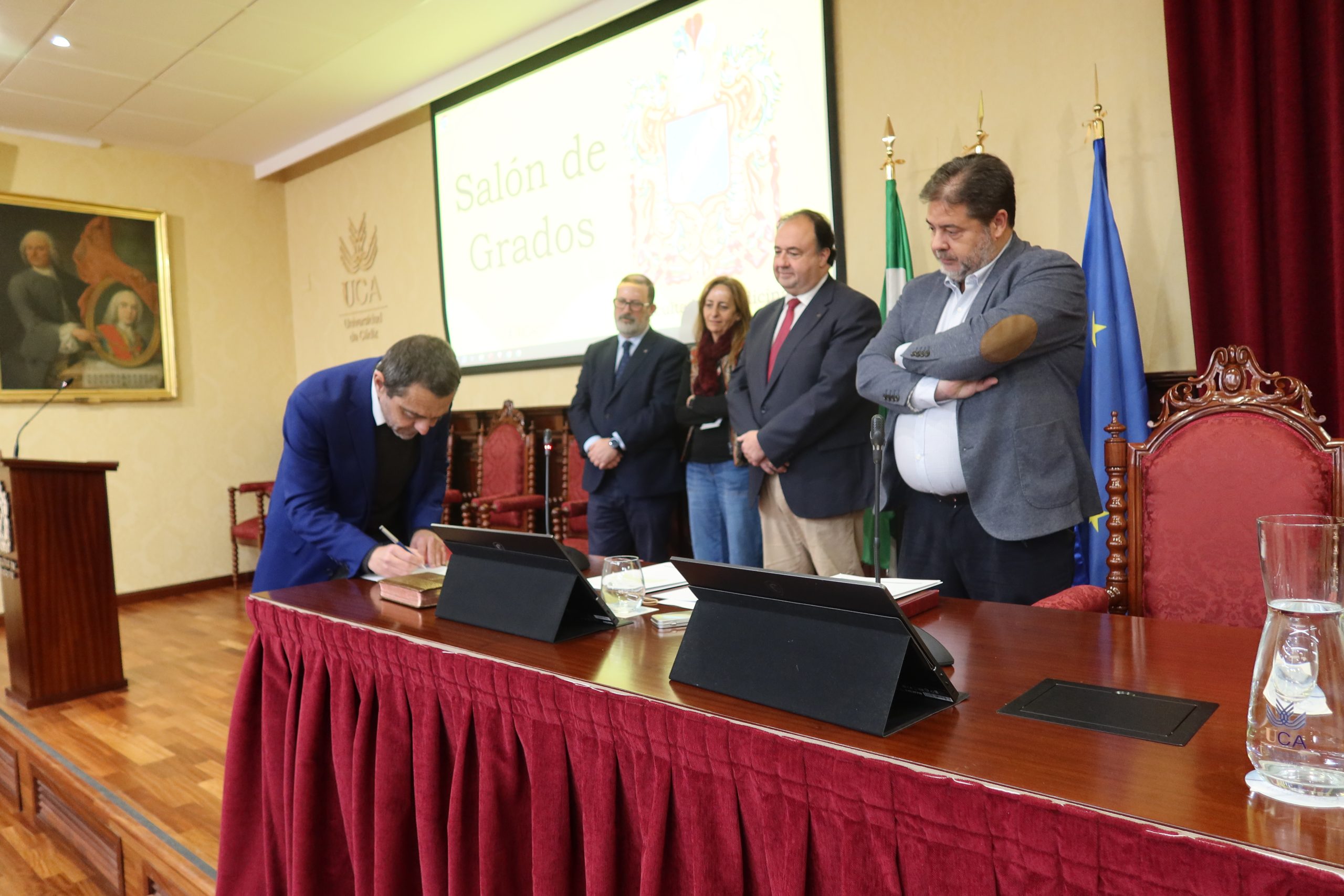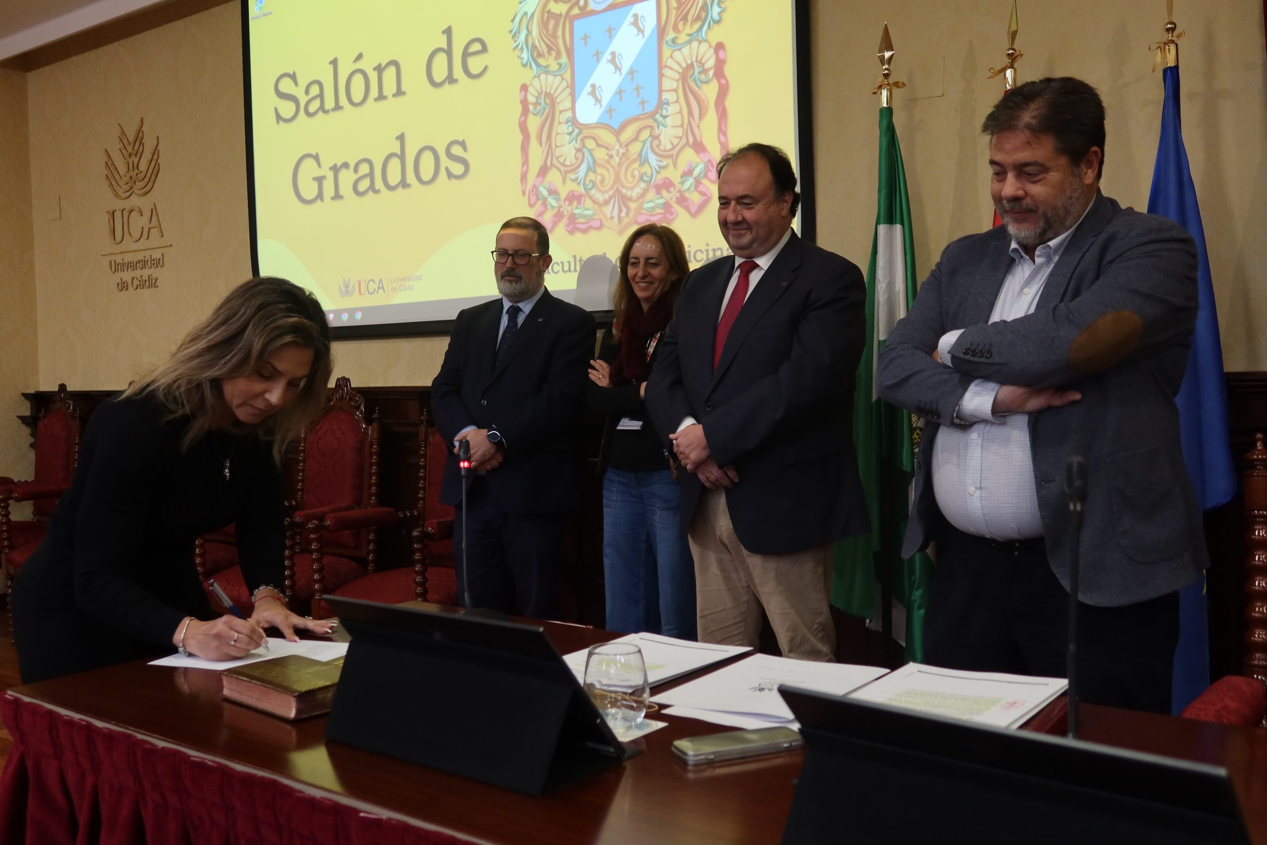 El rector de la Universidad de Cádiz, Casimiro Mantell, junto con el secretario General de la UCA, Manuel Rozados, en compañía de los vicerrectores de Profesorado e Investigación y Transferencia, José Antonio Perales y Mª Jesús Ortega, respectivamente, ha presidido hoy, en la Facultad de Medicina en el Campus de Cádiz, la toma de posesión de cuatro profesores titulares y una directora de departamento.