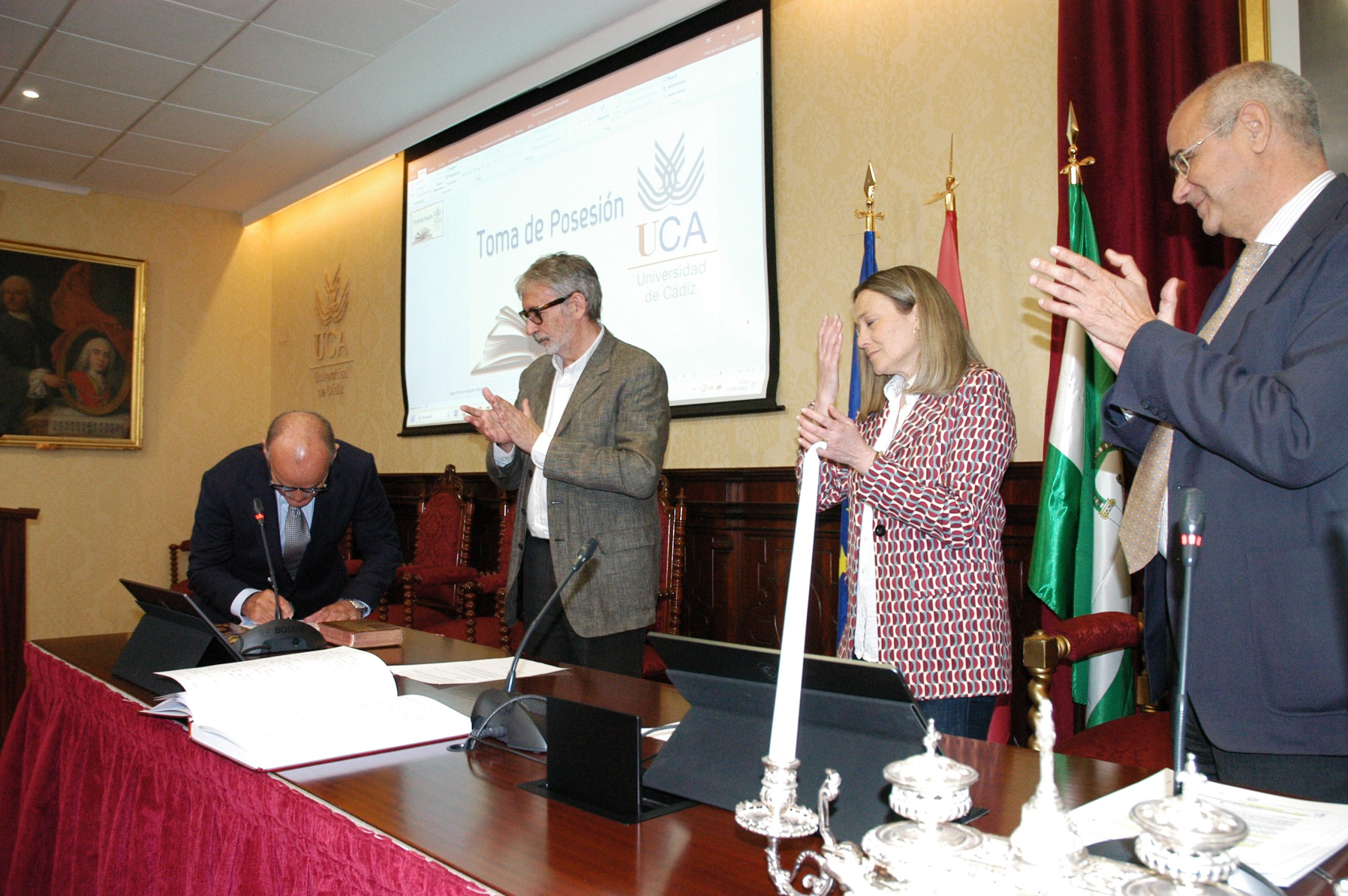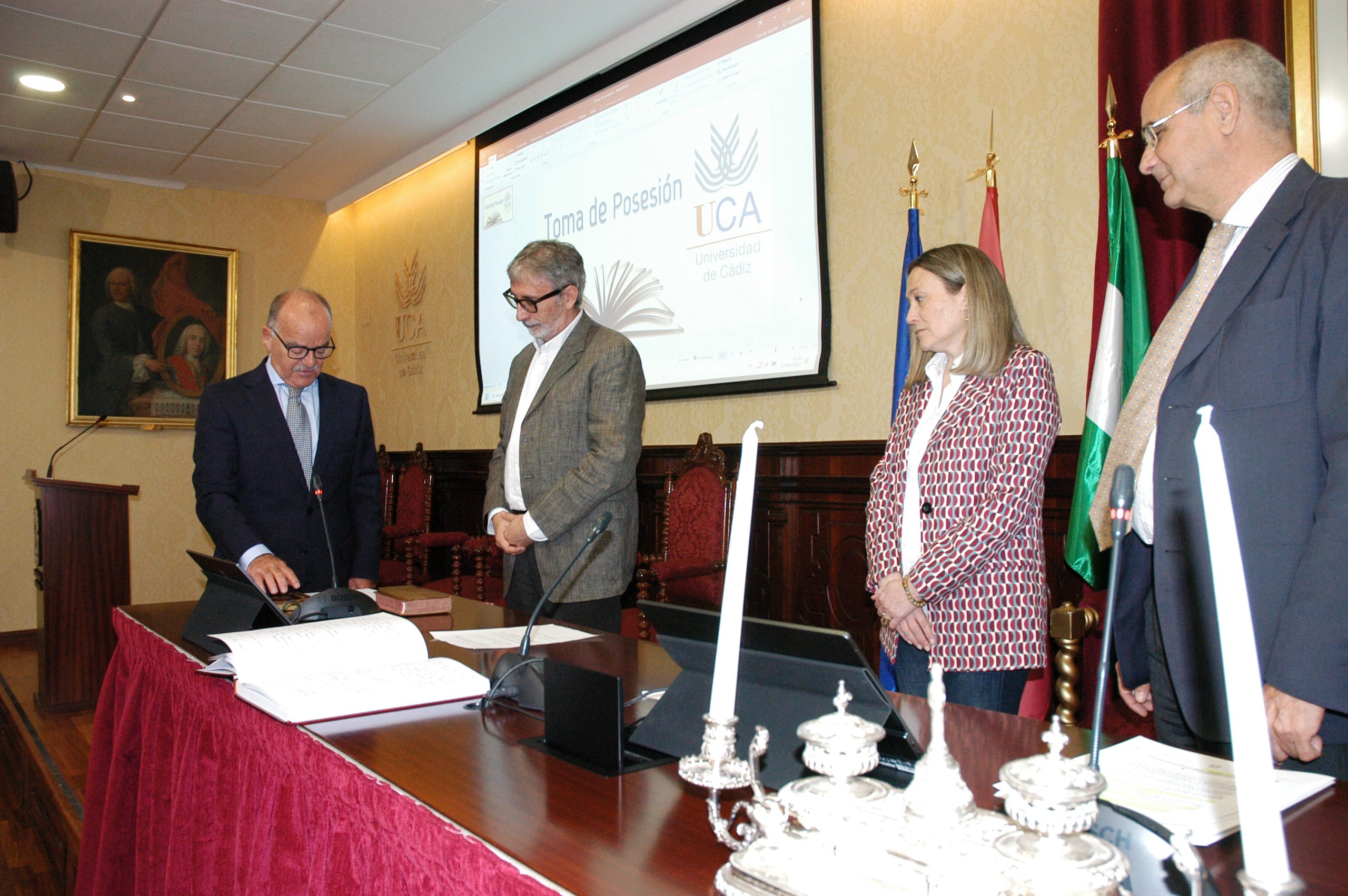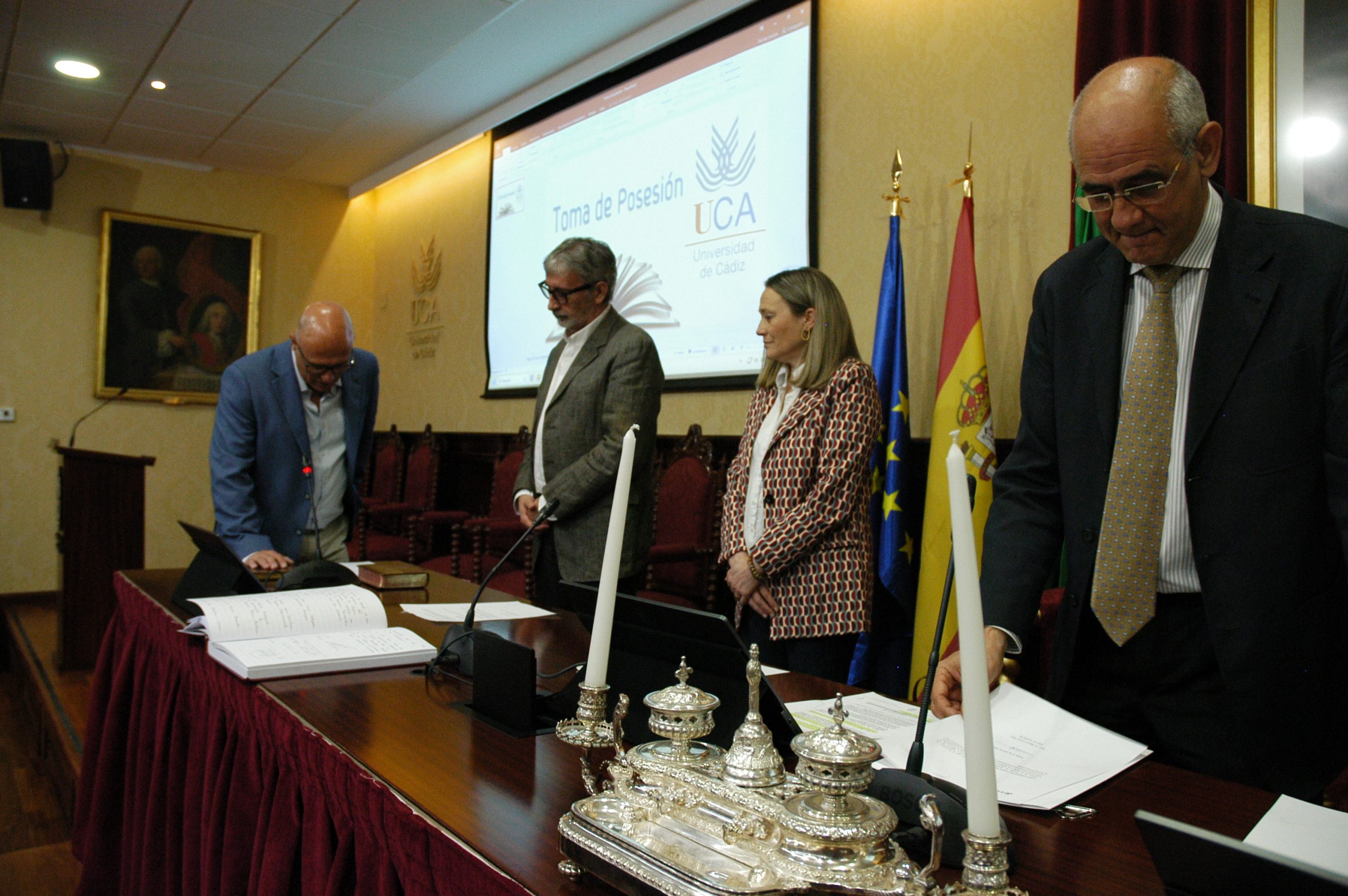El rector de la Universidad de Cádiz, Francisco Piniella, en compañía del secretario General, José Justo Megías, y la gerente, Mariví Martínez, ha presidido hoy la toma de posesión, en el salón de Grados de la Facultad de Medicina, del decano de la Facultad de Ciencias del Trabajo y dos funcionarios del área de Biblioteca, Archivo y Publicaciones.