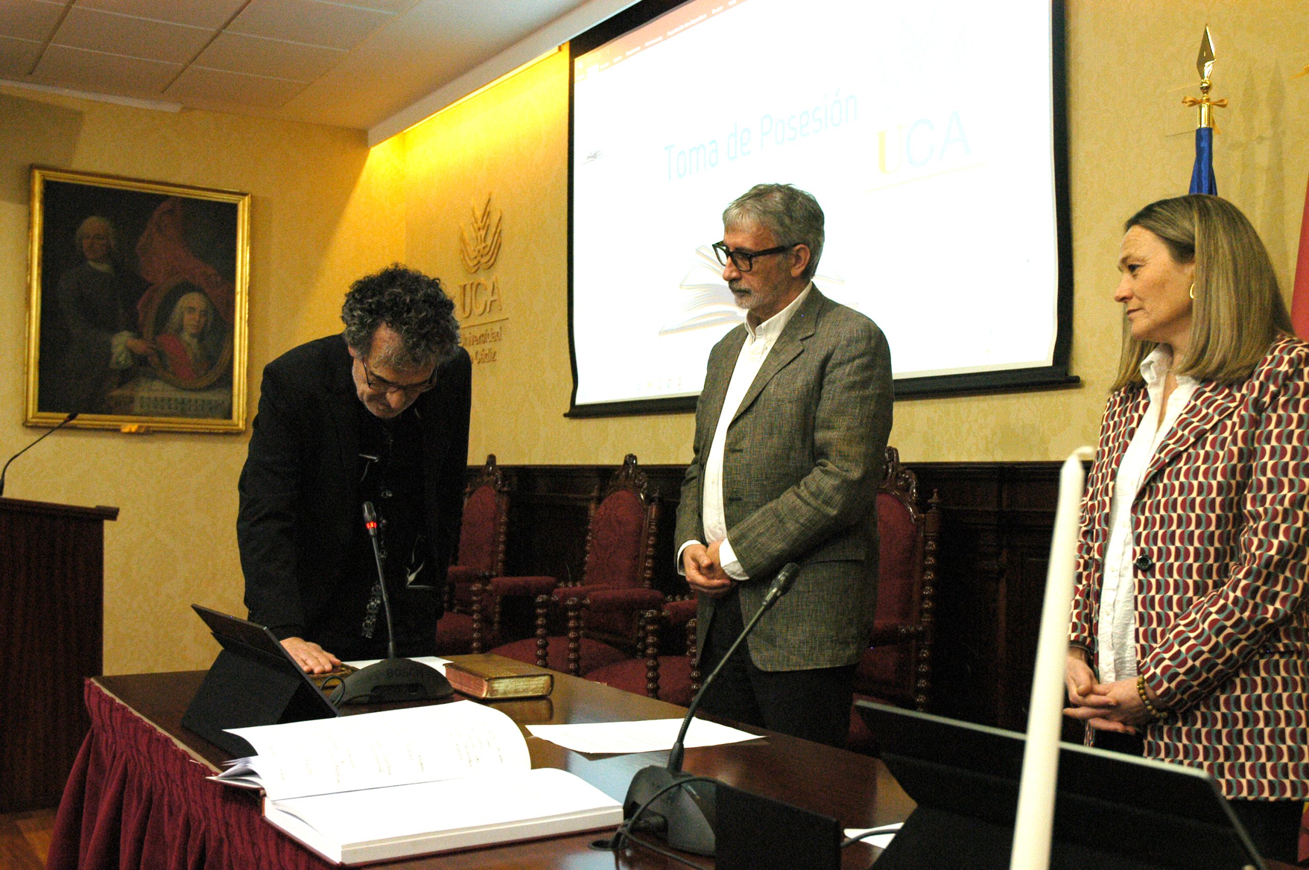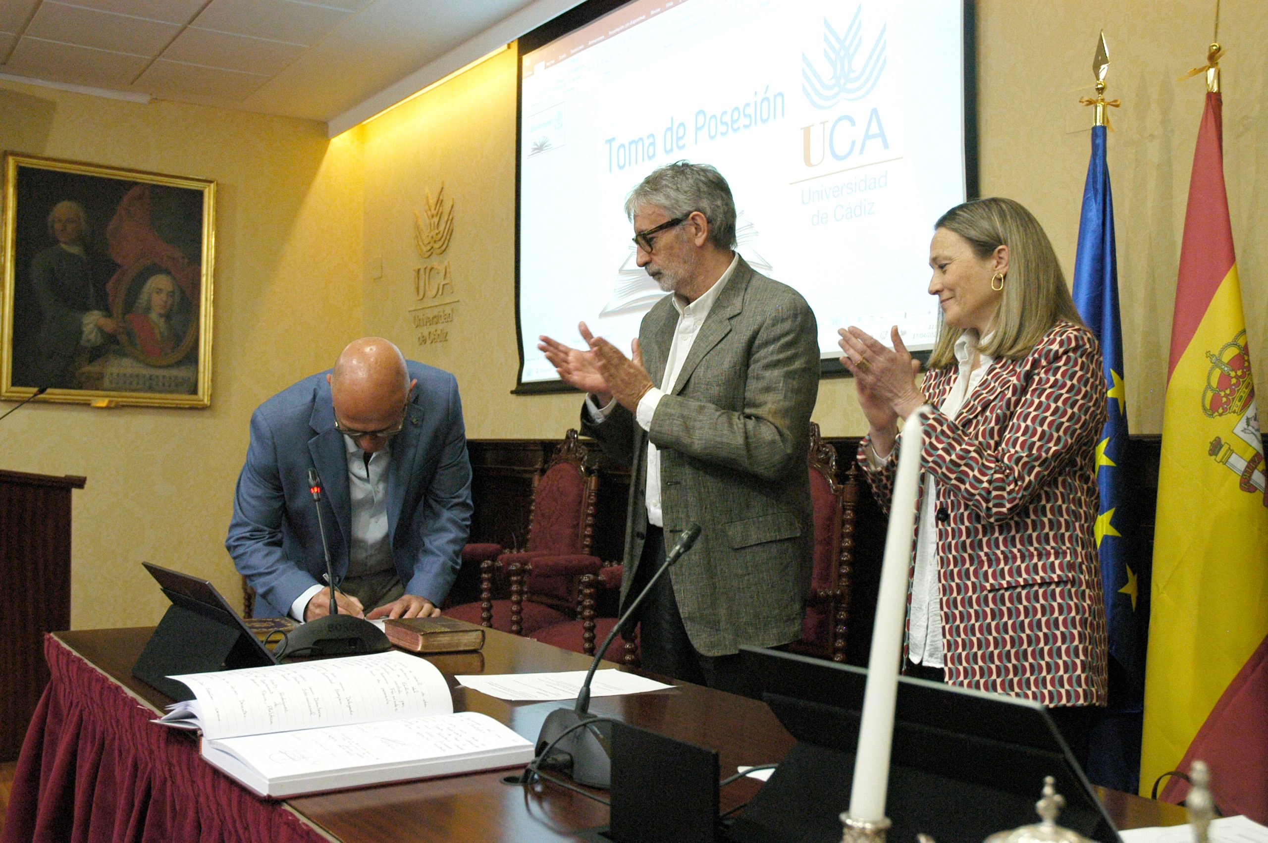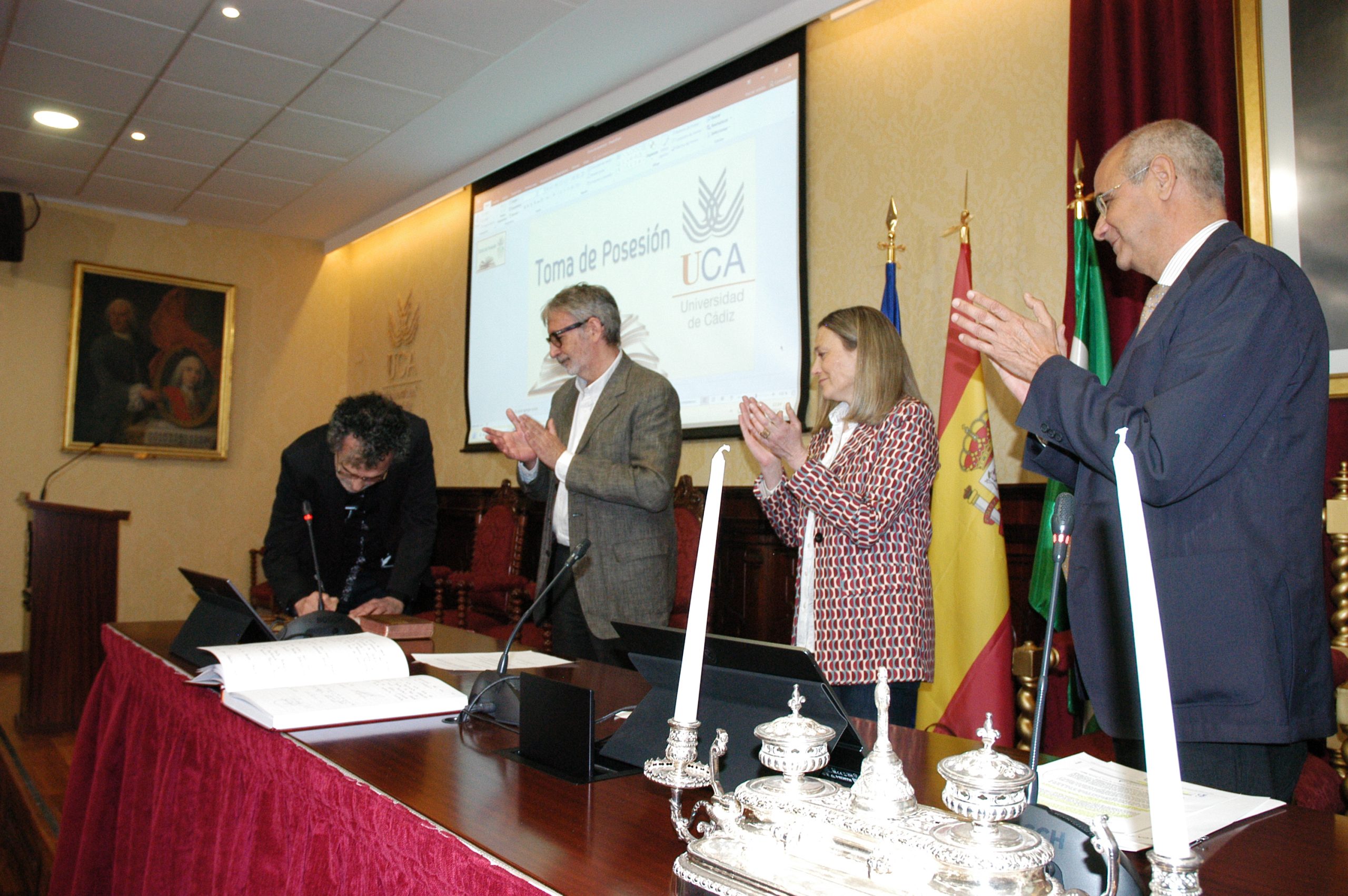El rector de la Universidad de Cádiz, Francisco Piniella, en compañía del secretario General, José Justo Megías, y la gerente, Mariví Martínez, ha presidido hoy la toma de posesión, en el salón de Grados de la Facultad de Medicina, del decano de la Facultad de Ciencias del Trabajo y dos funcionarios del área de Biblioteca, Archivo y Publicaciones.