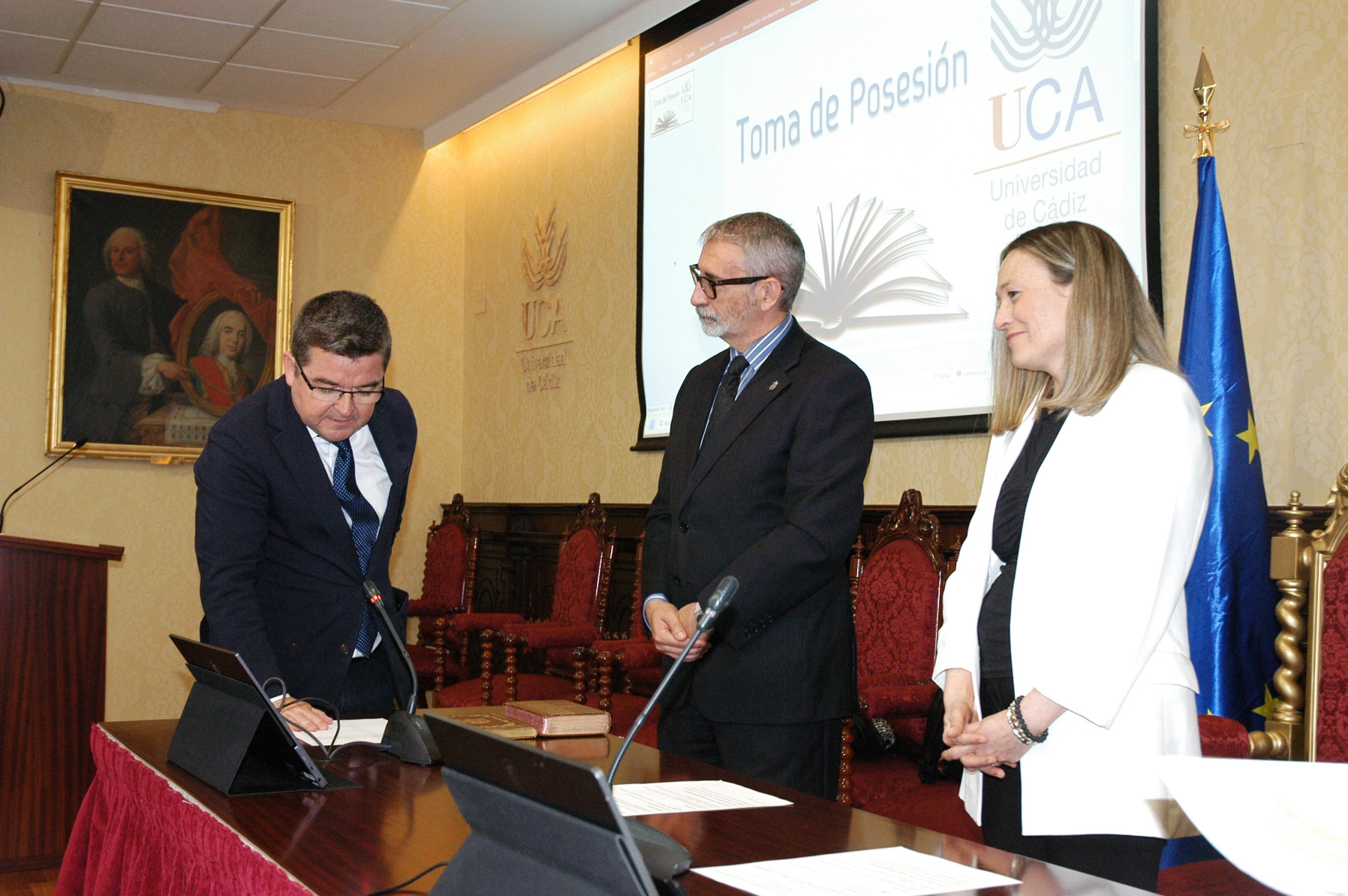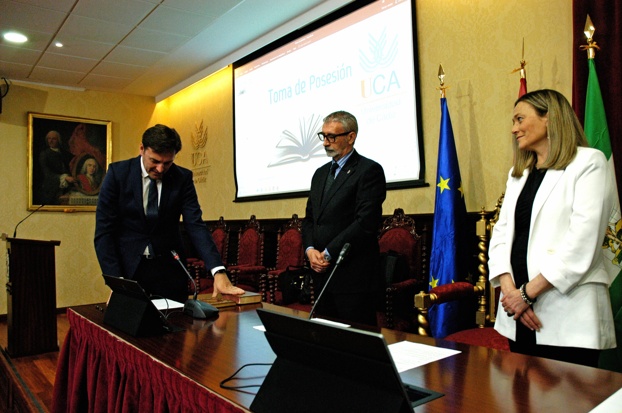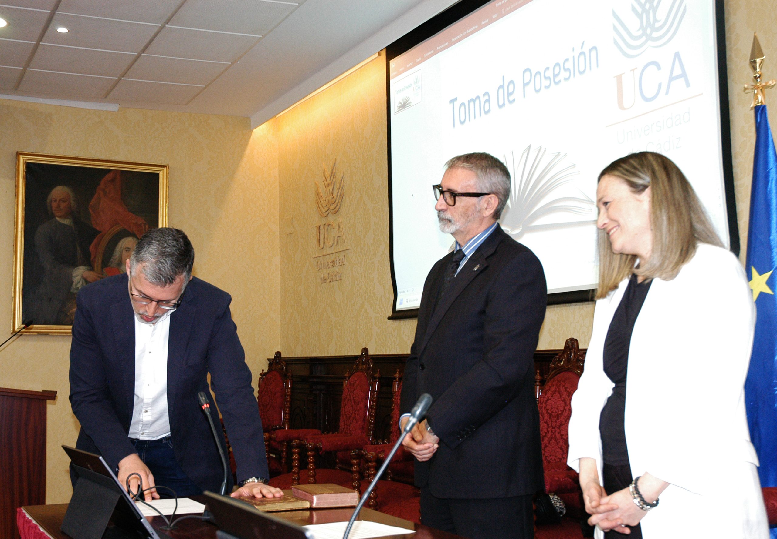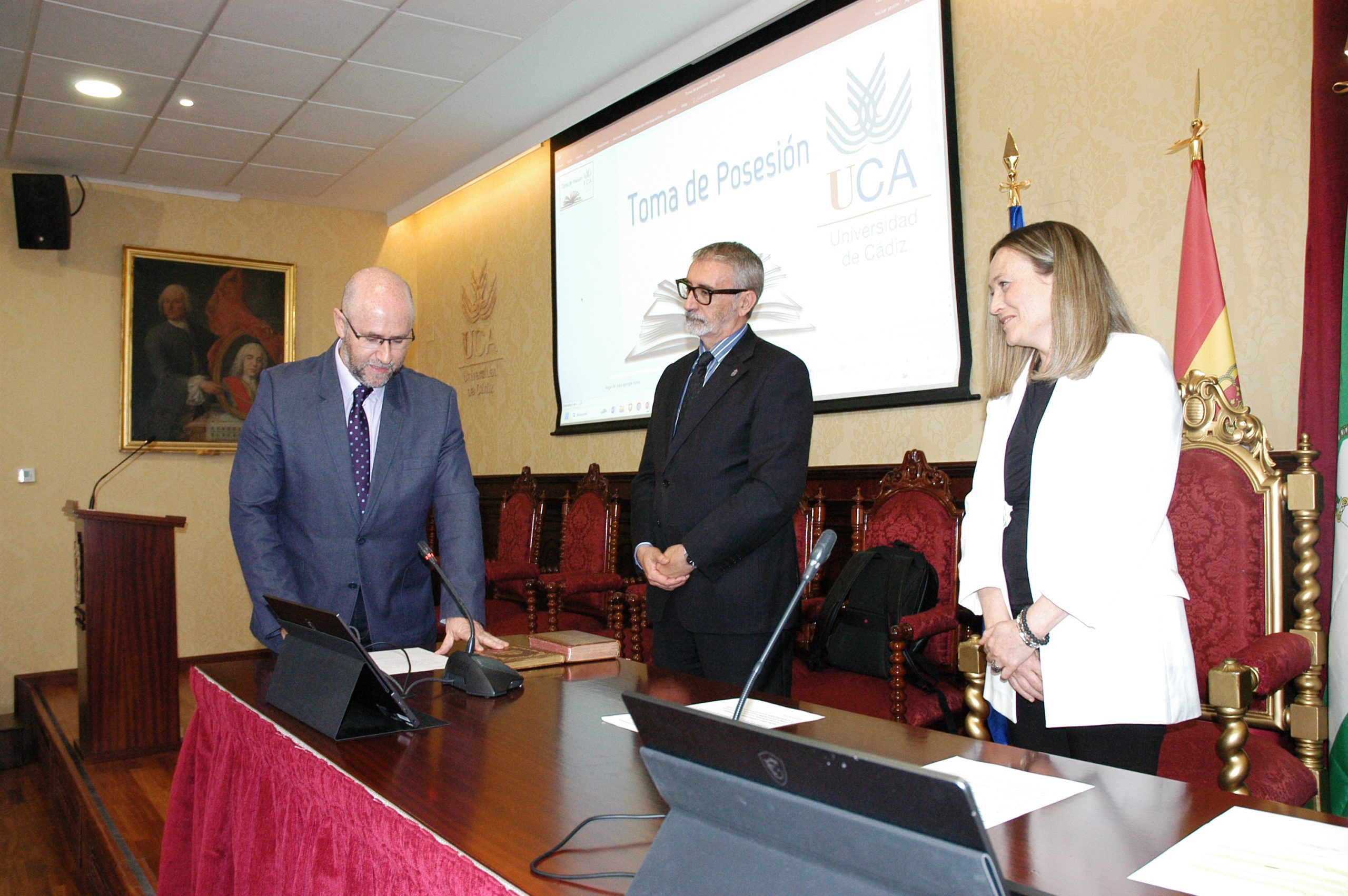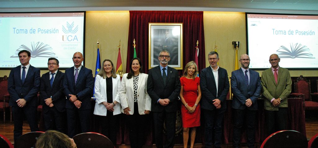 El rector de la Universidad de Cádiz, Francisco Piniella, en compañía del secretario General, José Justo Megías, y la gerente, Mariví Martínez, ha presidido hoy la toma de posesión del decano de la Facultad de Ciencias, un cargo académico, dos catedráticos y tres funcionarios del Personal de Administración y Servicios en el salón de Grados de la Facultad de Medicina.