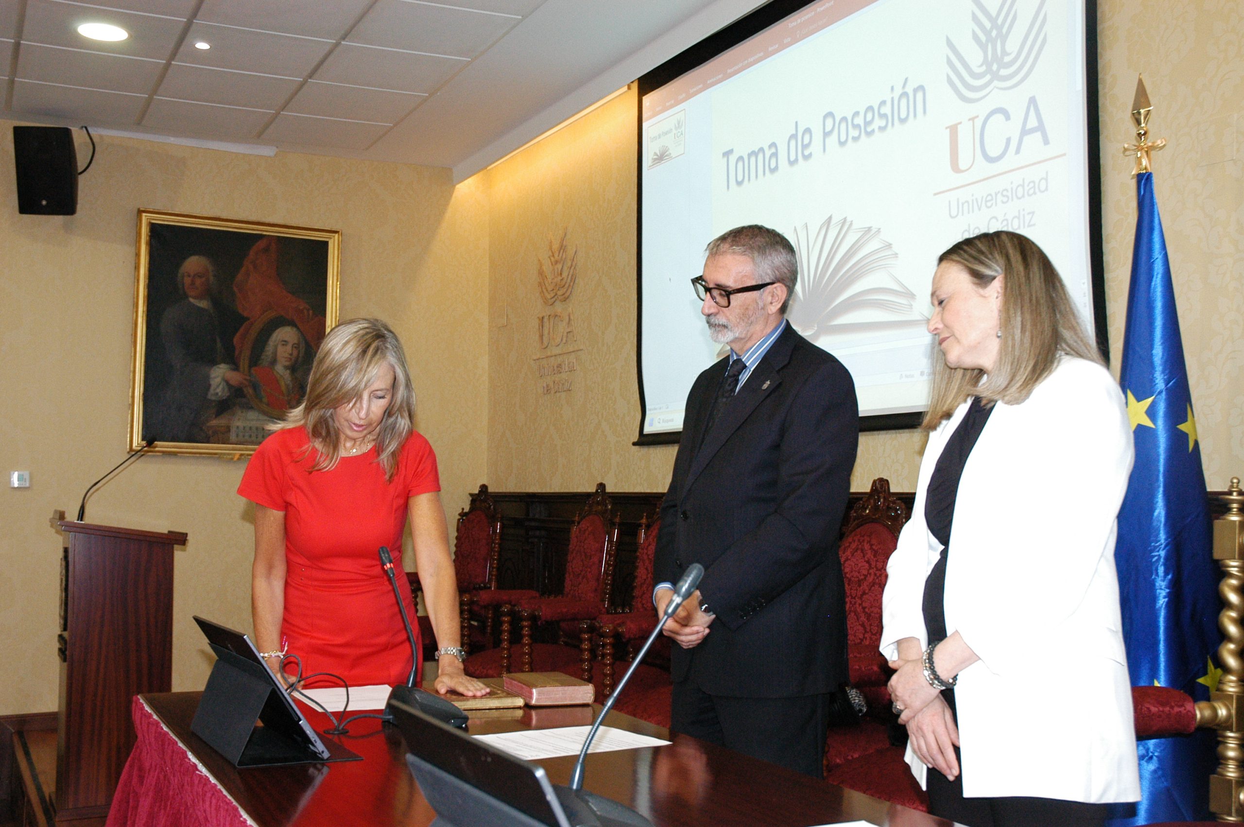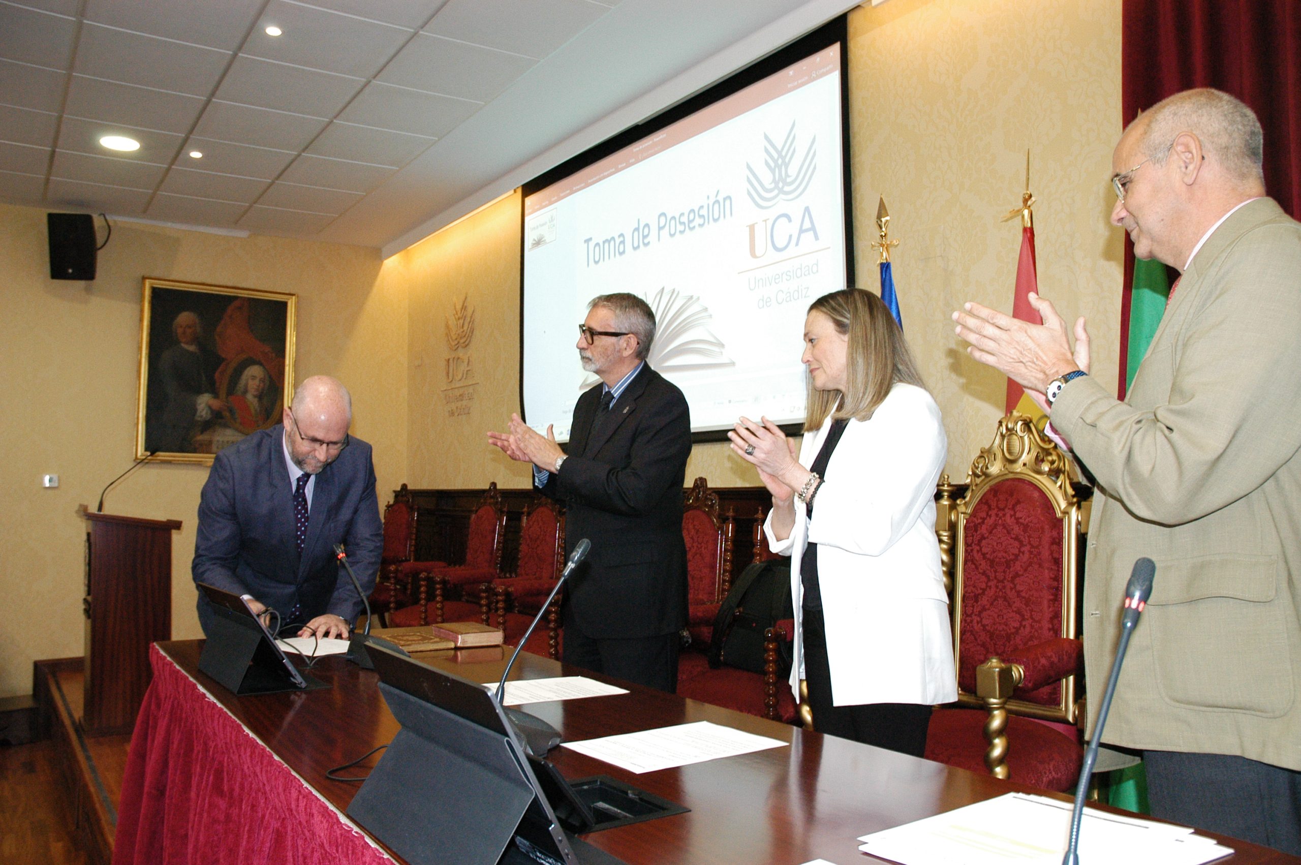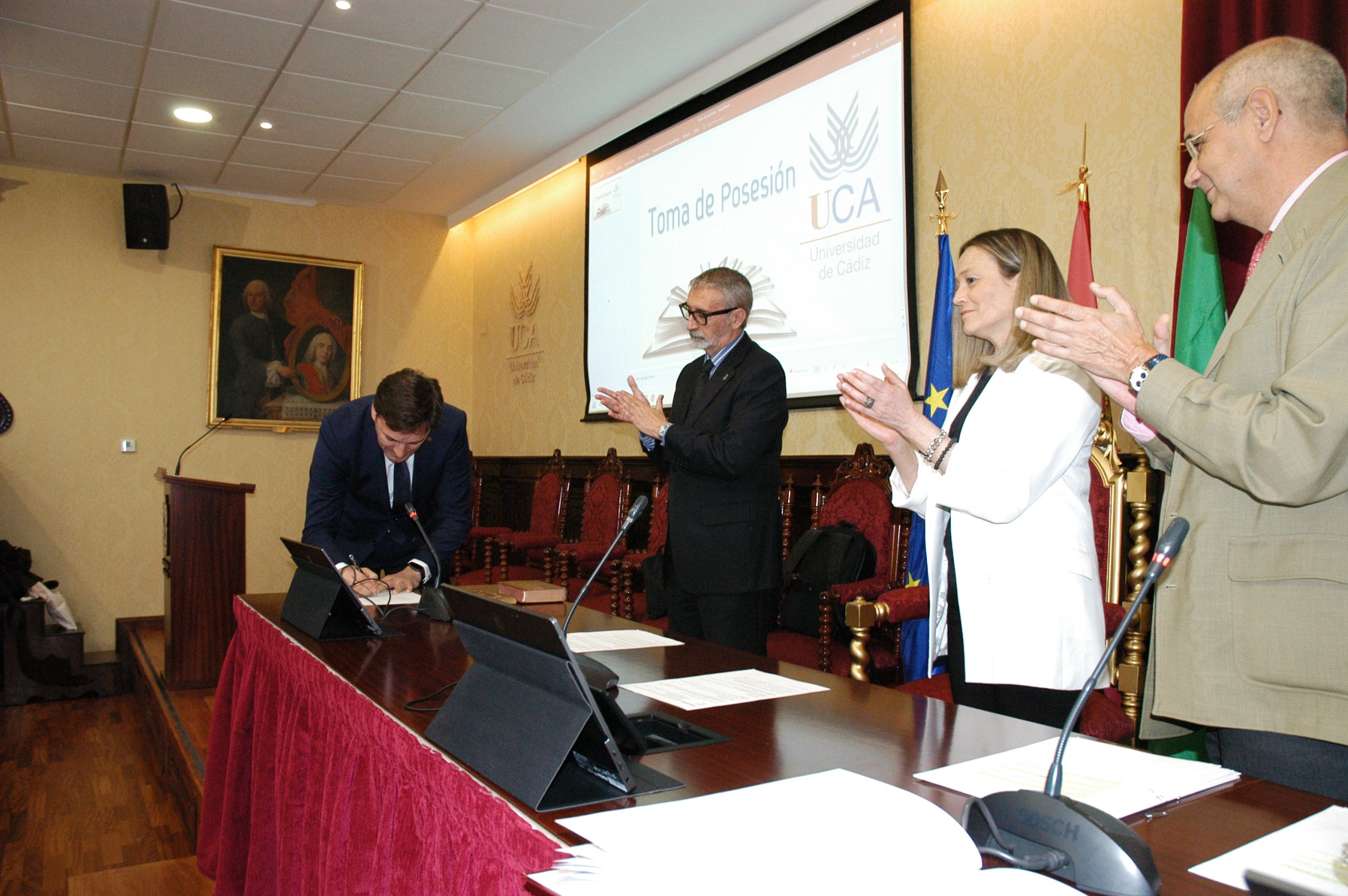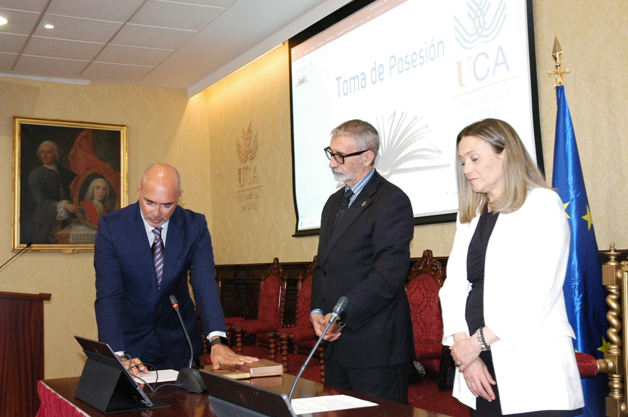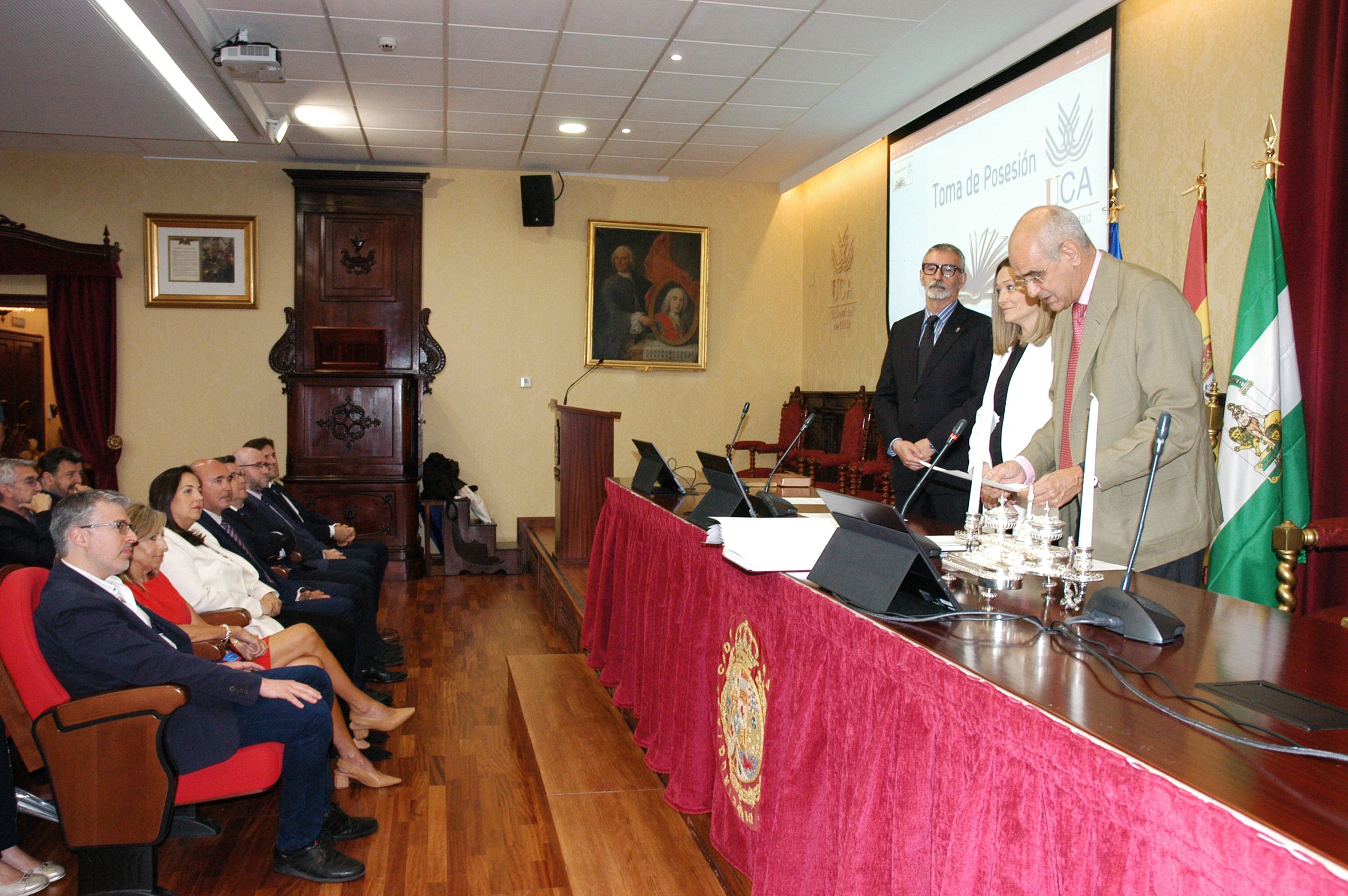 El rector de la Universidad de Cádiz, Francisco Piniella, en compañía del secretario General, José Justo Megías, y la gerente, Mariví Martínez, ha presidido hoy la toma de posesión del decano de la Facultad de Ciencias, un cargo académico, dos catedráticos y tres funcionarios del Personal de Administración y Servicios en el salón de Grados de la Facultad de Medicina.
