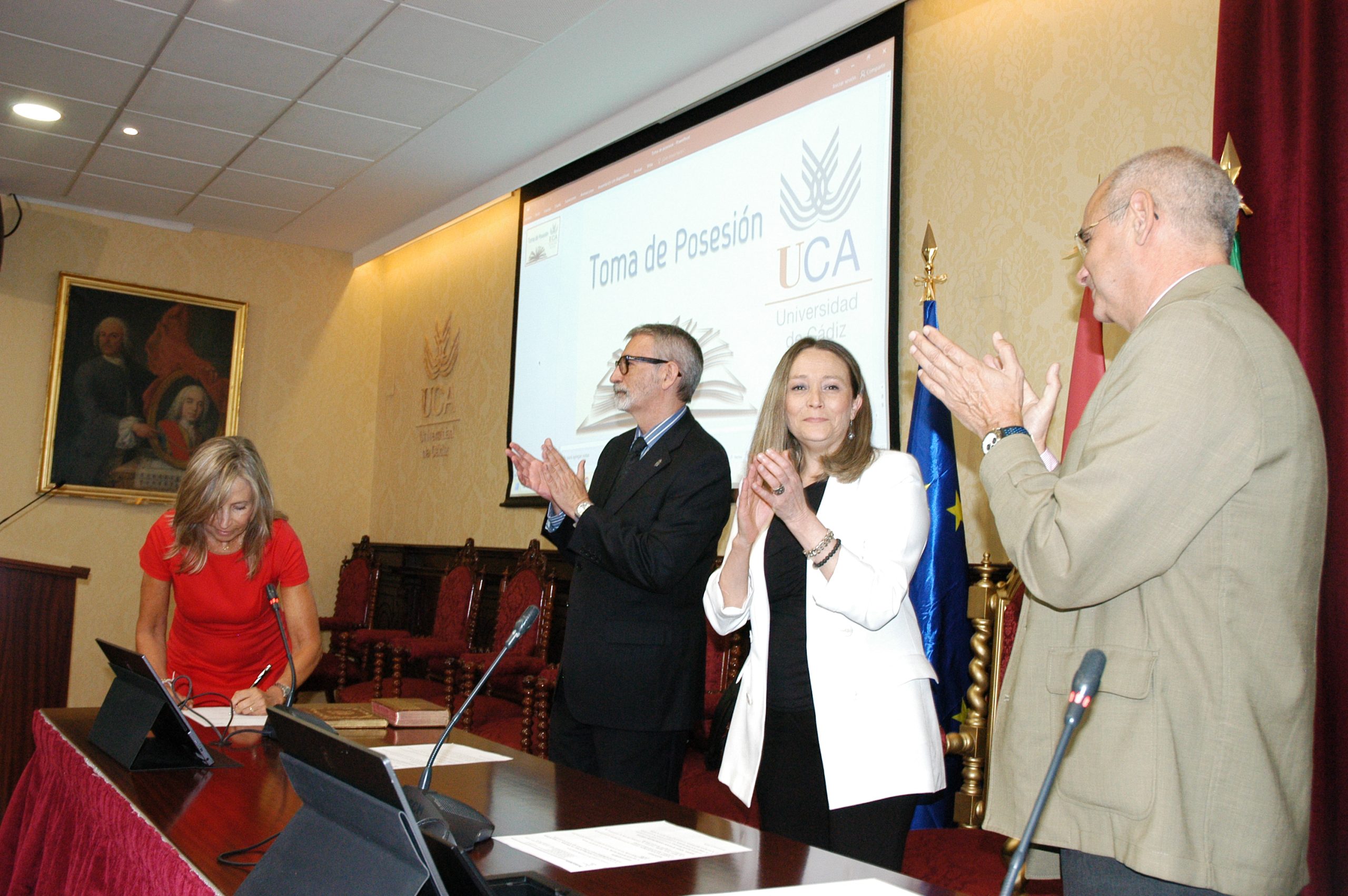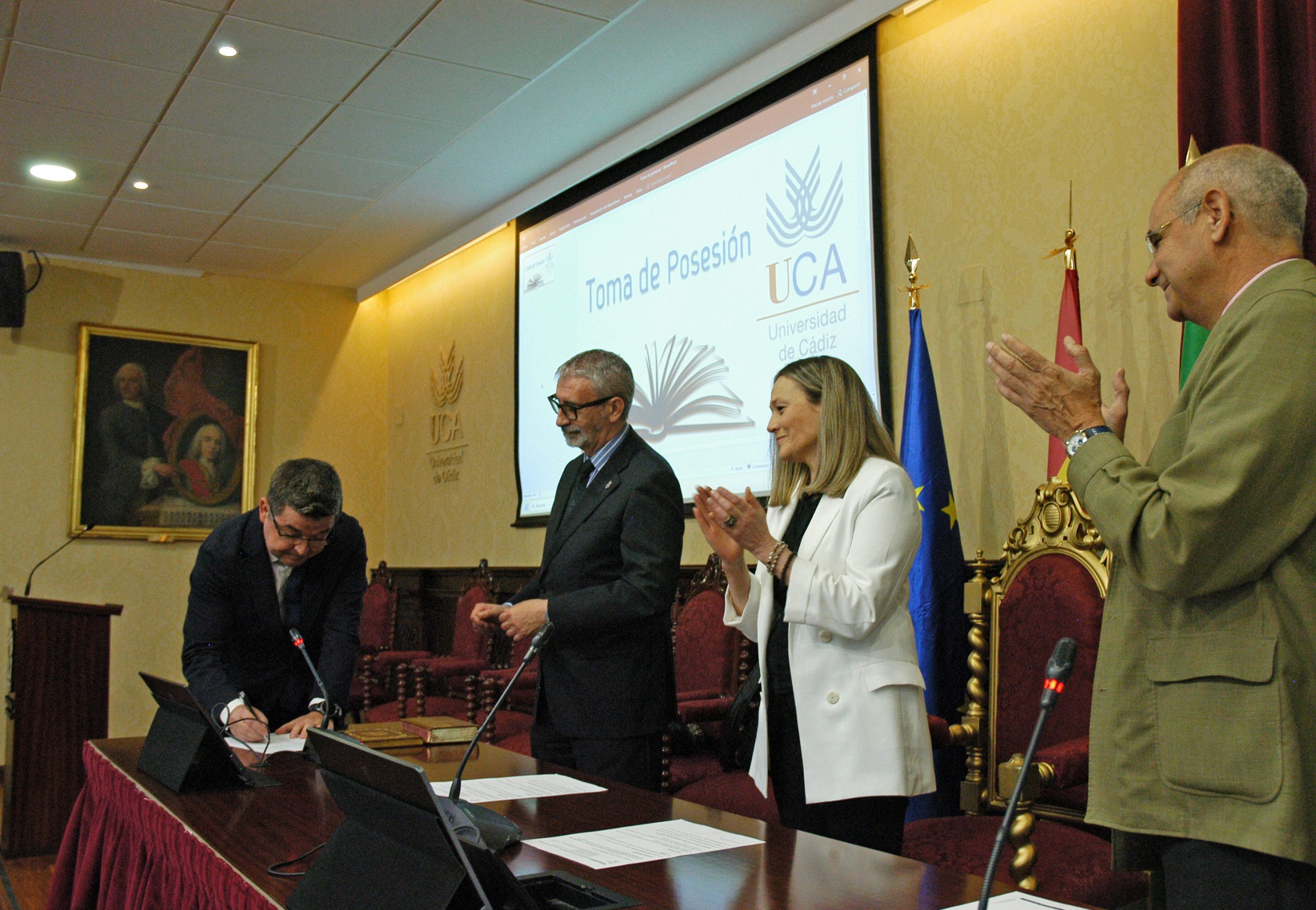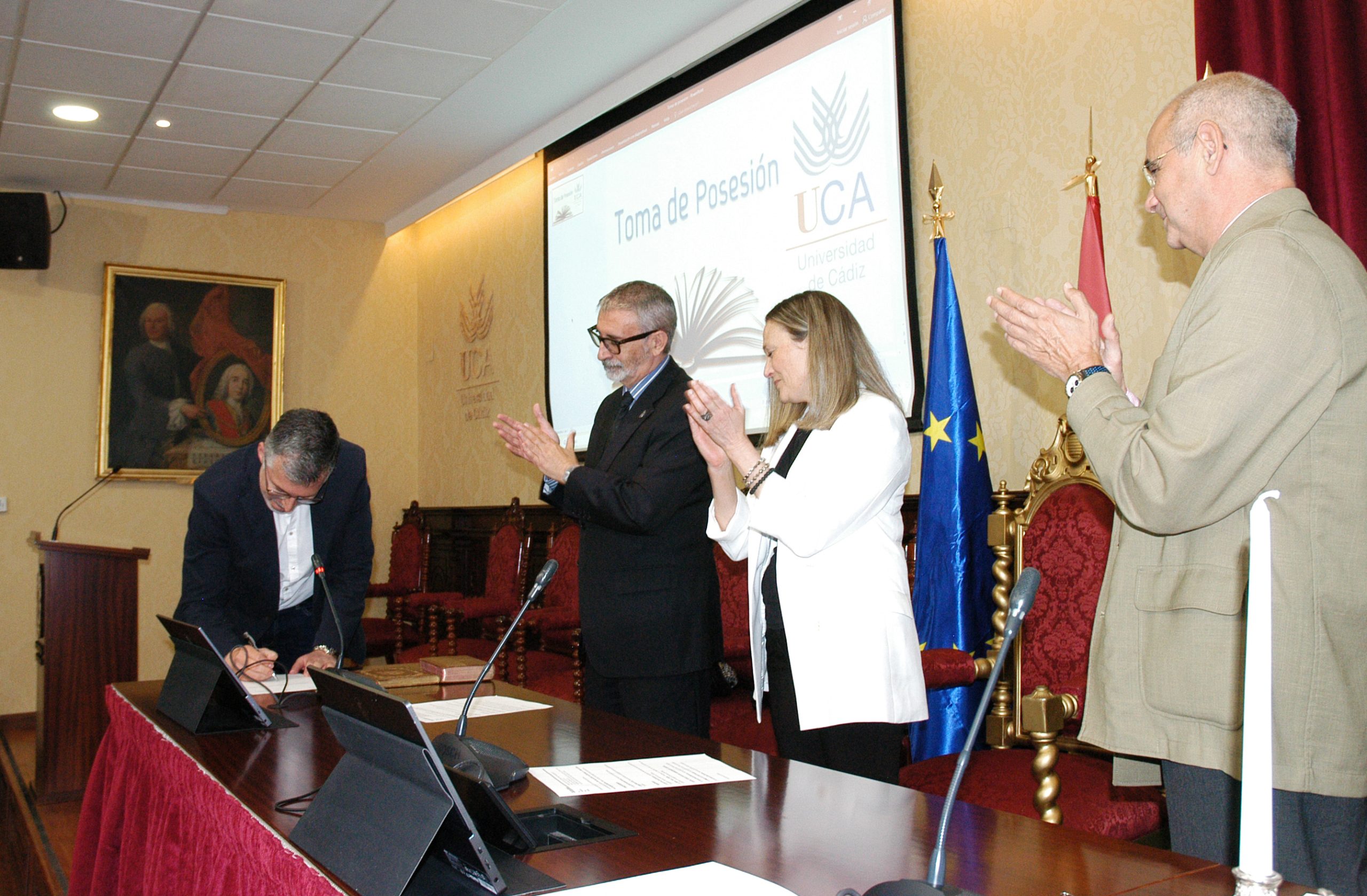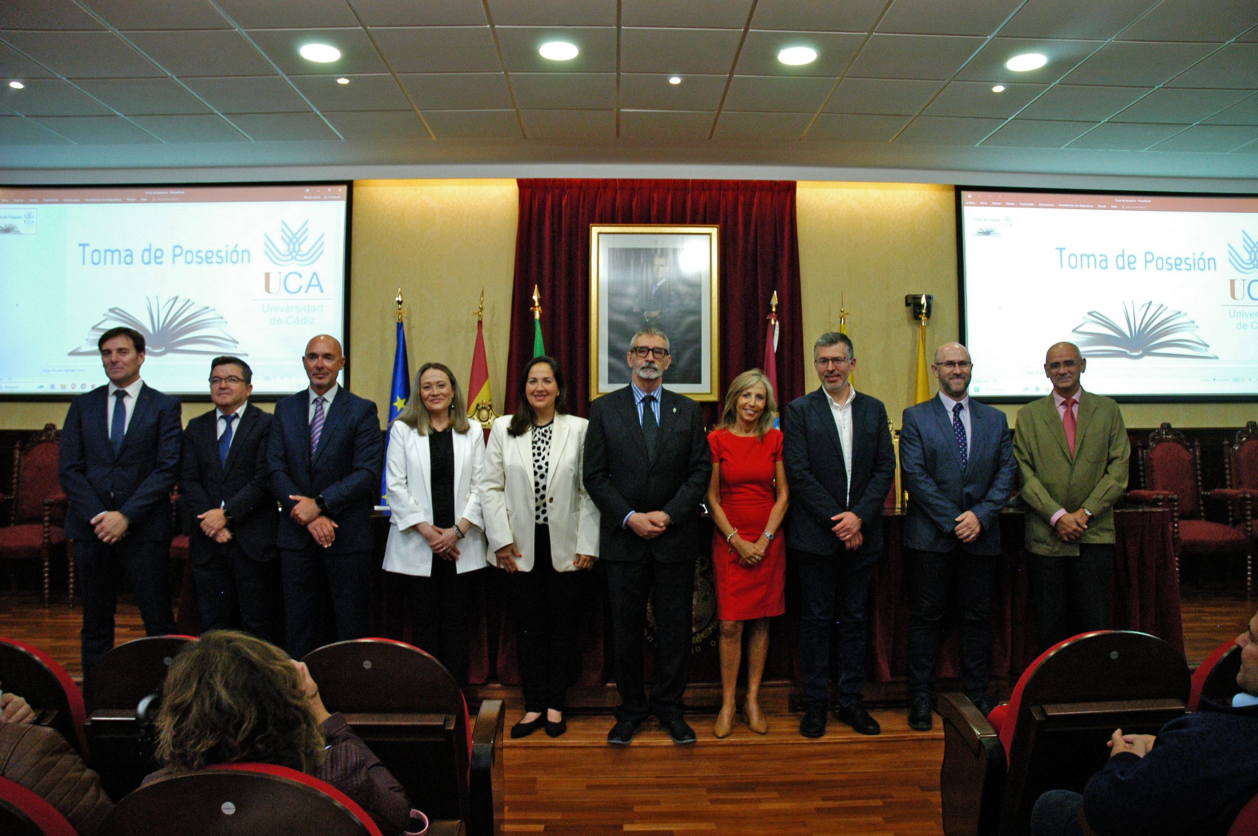 El rector de la Universidad de Cádiz, Francisco Piniella, en compañía del secretario General, José Justo Megías, y la gerente, Mariví Martínez, ha presidido hoy la toma de posesión del decano de la Facultad de Ciencias, un cargo académico, dos catedráticos y tres funcionarios del Personal de Administración y Servicios en el salón de Grados de la Facultad de Medicina.