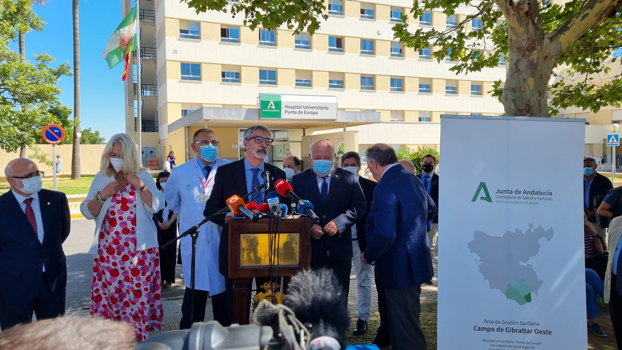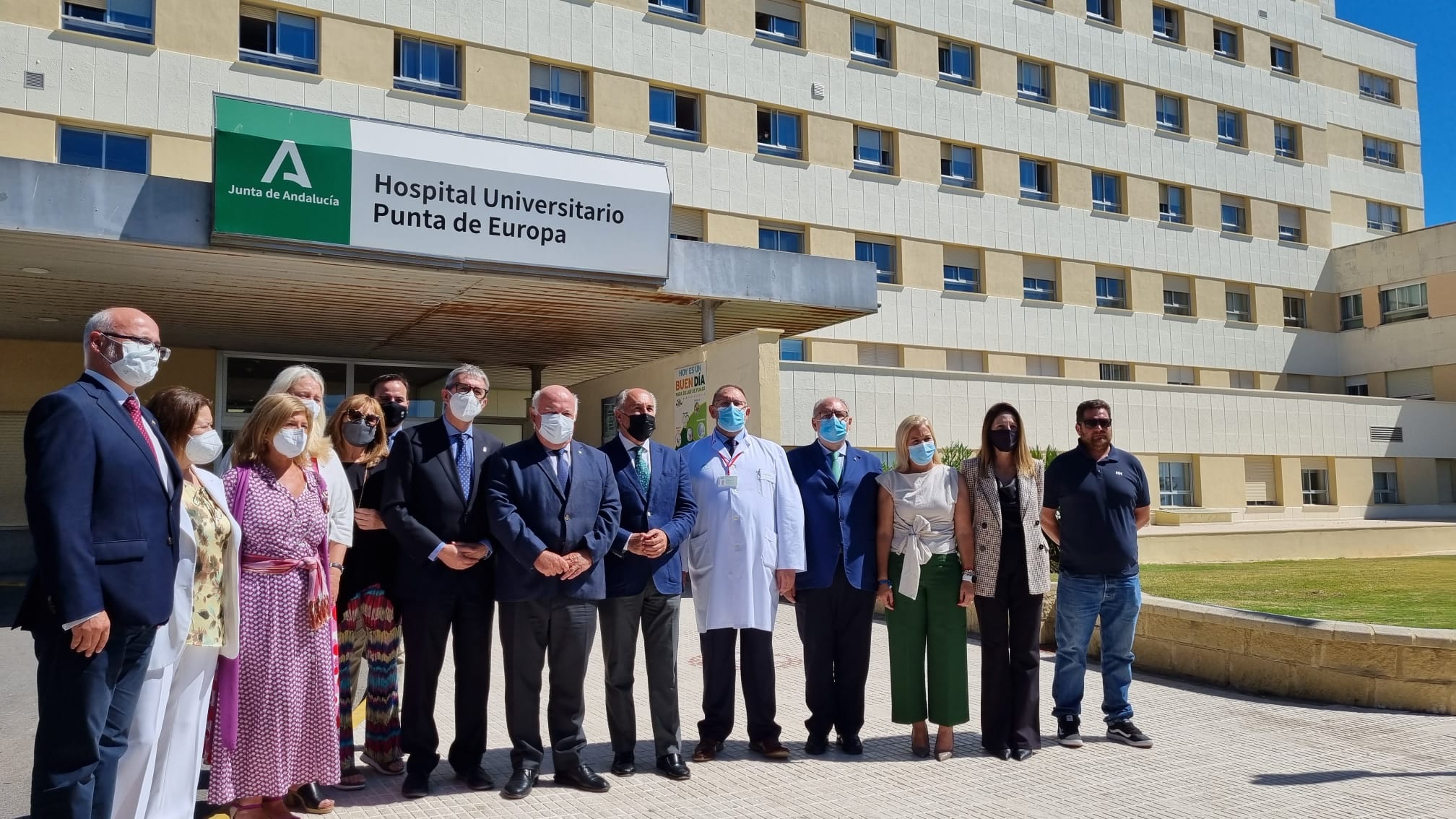 El consejero de Salud y Familias de la Junta de Andalucía, Jesús Aguirre, el rector de la Universidad de Cádiz, Francisco Piniella, y el alcalde de Algeciras, José Ignacio Landaluce, junto a otras autoridades políticas y académicas han visitado hoy el Hospital Universitario Punta de Europa de Algeciras (Cádiz), tras ser declarado recientemente como hospital universitario mediante el acuerdo adoptado por la Junta de Andalucía, a través de la Secretaría General de Investigación, Desarrollo e Innovación en Salud, y la Universidad de Cádiz.