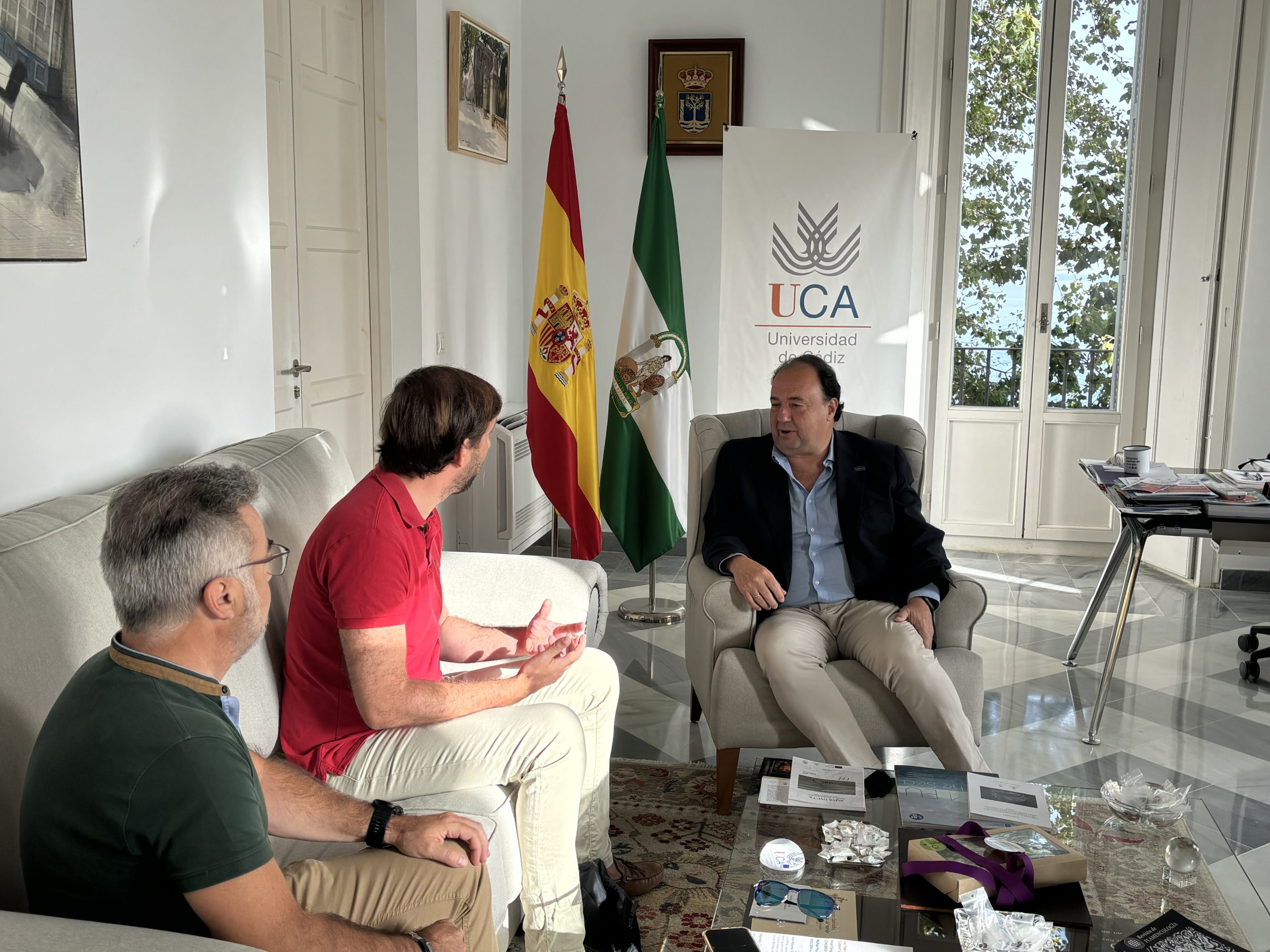 El rector de la Universidad de Cádiz, Casimiro Mantell, se ha reunido hoy en el Rectorado con la comisión ejecutiva de la Asociación de Jóvenes Empresarios de Cádiz, liderada por su presidente, Juan Antonio Parra. Los ha acompañado la vicerrectora de Emprendimiento y Empleabilidad, Carmen Camelo.