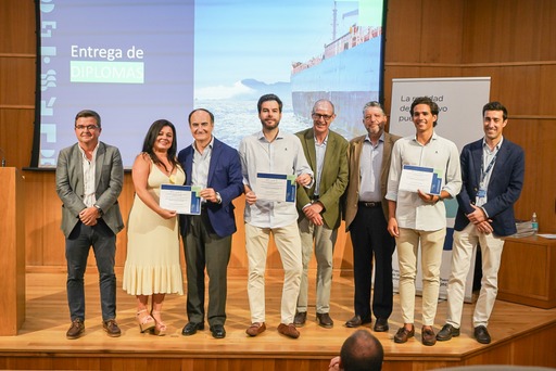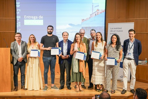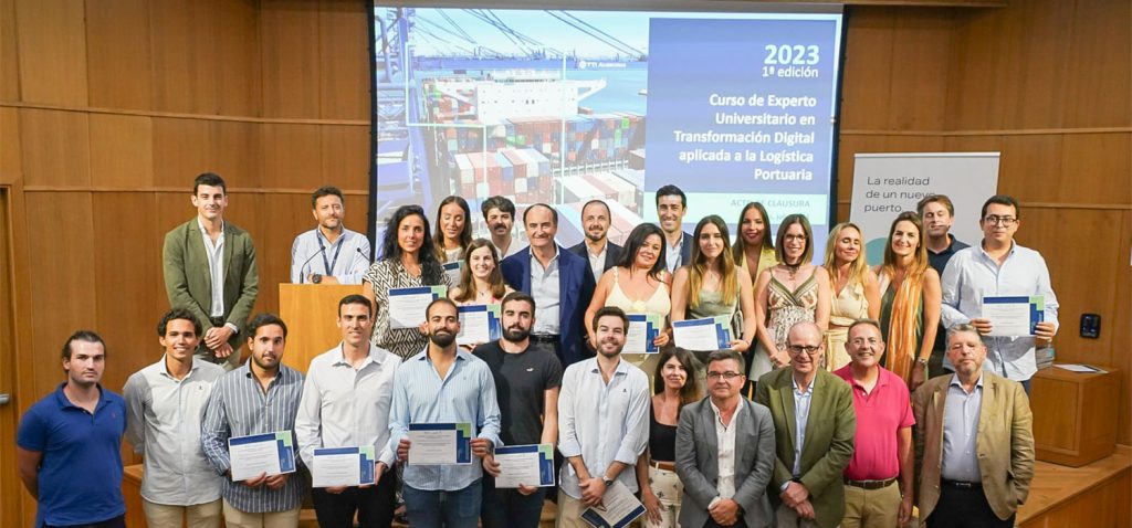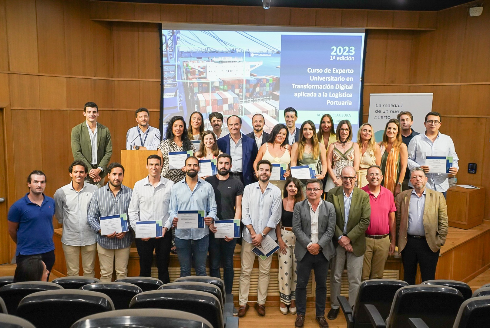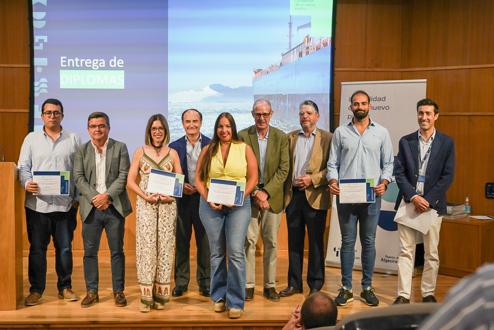 El presidente de la Autoridad Portuaria Bahía de Algeciras, Gerardo Landaluce, y el vicerrector en funciones del Campus Bahía de Algeciras de la Universidad de Cádiz, Jesús Verdú, han presidido el acto de clausura de la primera edición del curso de Experto en Transformación Digital aplicada a la Logística Portuaria, en donde un total de 17 estudiantes recogieron sus diplomas y presentaron los resultados de sus trabajos fin de curso sobre temas tan relevantes en este ámbito como la “Digitalización de proceso de inspección en depósito de contenedores” o la “Optimización del intercambio de información y documentación entre agentes portuarios”.