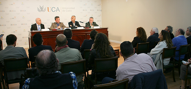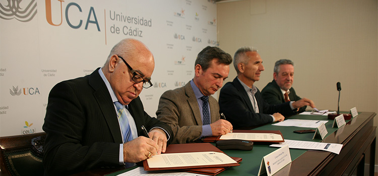 El rector de la Universidad de Cádiz, Eduardo González Mazo, y el presidente del Aula de Cultura del Carnaval de Cádiz-Centro de Documentación, Agustín Rubiales, en compañía del consejero de Cultura de la Junta de Andalucía, Miguel Ángel Vázquez, y del catedrático de Historia Contemporánea de la UCA, Alberto Ramos, han firmado hoy en el Rectorado un protocolo general de colaboración y un convenio específico para la creación de la Cátedra de Carnaval de Cádiz, cuyo objetivo es profundizar en el conocimiento, estudio y divulgación de la fiesta popular gaditana a través de distintas acciones académicas y científicas: congresos, jornadas, trabajos fin de grado, trabajos fin de máster, tesis doctorales, publicaciones, etc.