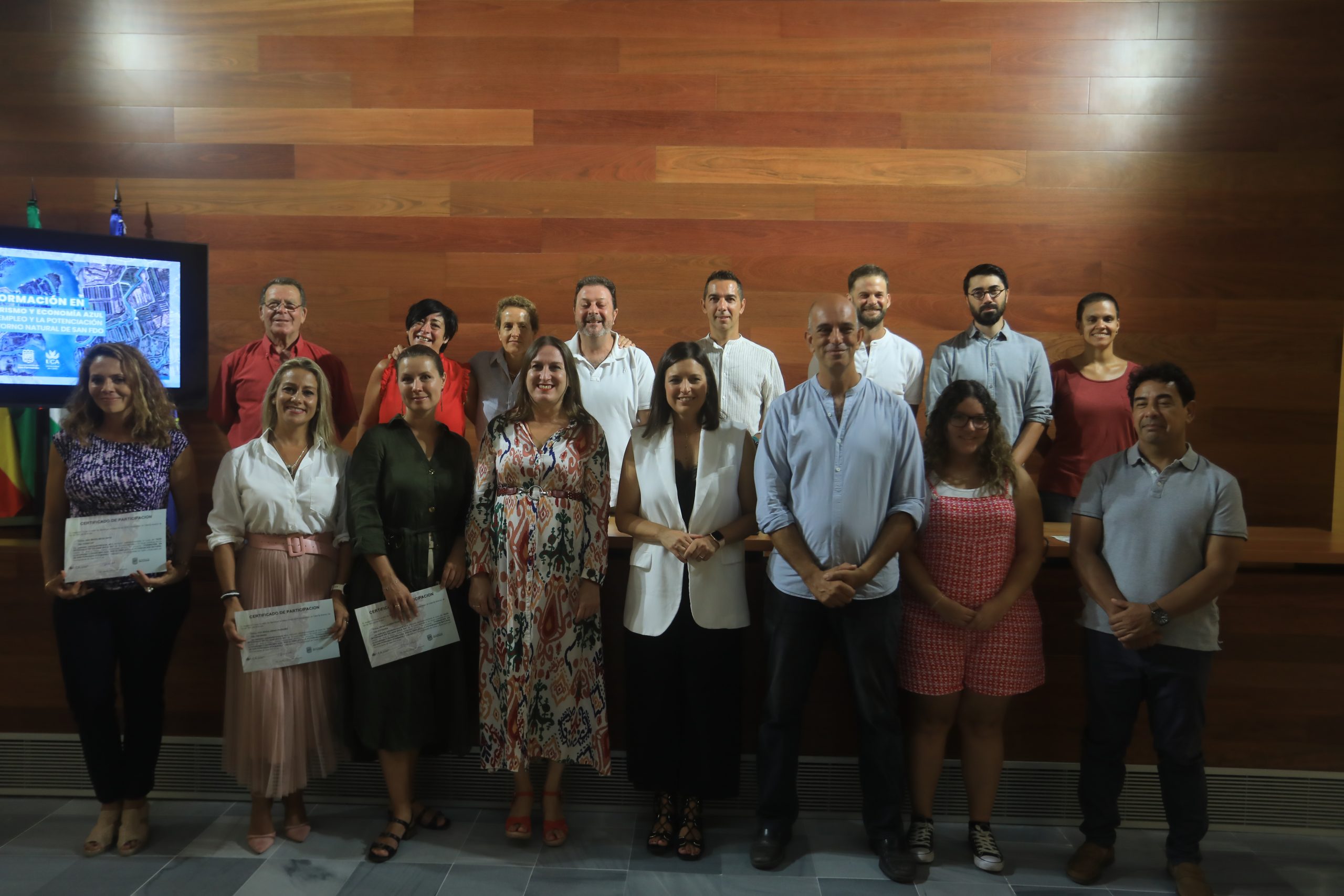 La alcaldesa de San Fernando, Patricia Cavada, y la delegada de Empleo y Emprendimiento, Regla Moreno, acompañadas del profesor de la Universidad de Cádiz y responsable del grupo de investigación Conservación de Humedales Costeros y director de los Servicios Centrales de Investigación en Salinas (SC-ISE) de la UCA, las Salinas la Esperanza, Alejandro Pérez Hurtado, han entregado los diplomas de los cursos ‘Guía-Intérprete de las Salinas’ y ‘Salicultores del Siglo XXI’ en el Ayuntamiento de San Fernando. Una formación con la participación de 34 personas que ha obtenido, de momento, el 35% de empleabilidad de su alumnado, con la contratación de dos de ellas por cuenta ajena y ocho crearán sus propias empresas acogidas en las instalaciones universitarias del SC-ISE en las Salinas la Esperanza.