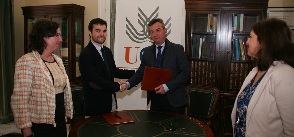 El rector de la Universidad de Cádiz, Eduardo González Mazo, y el director del Colegio Profesional de Licenciados y Graduados en Ciencias Ambientales de Andalucía, Manuel Barrera, en compañía de la decana de la Facultad de Ciencias del Mar y Ambientales, Milagrosa Casimiro-Soriguer, y la coordinadora del grado en Ciencias Ambientales de la UCA, Rocío Rodríguez, han firmado hoy – en el Rectorado – un protocolo general de colaboración en materia docente, investigadora y de transferencia, cuyos objetivos comunes priorizan la formación, la inserción laboral y la defensa del medio ambiente.