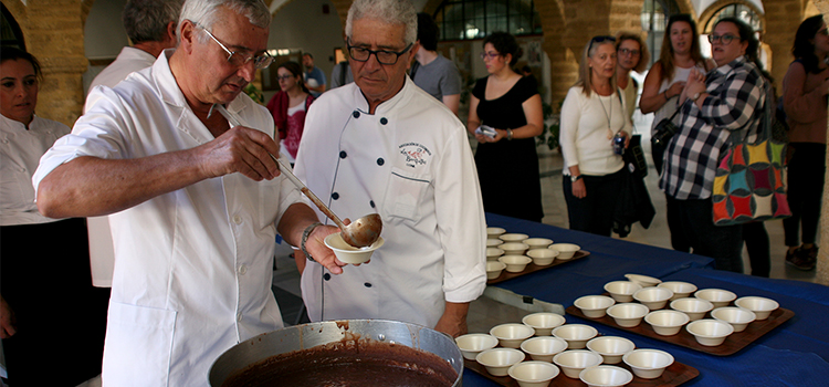 A continuación, en el patio del centro se desarrolla la actividad Degustamos el Tricentenario. La asociación Borriquete formada por cocineros de las localidades de Conil de la Frontera y Barbate presenta varios platos elaborados con productos llegados de América. Durante la degustación, estos profesionales ofrecen explicaciones a los asistentes acerca del origen americano de los productos y su fusión con otros europeos. Esta actividad finalizará con la escenificación teatral de una parte de la obra de Néstor Luján titulada La puerta del Oro, concretamente con el capítulo donde se narra un almuerzo histórico.