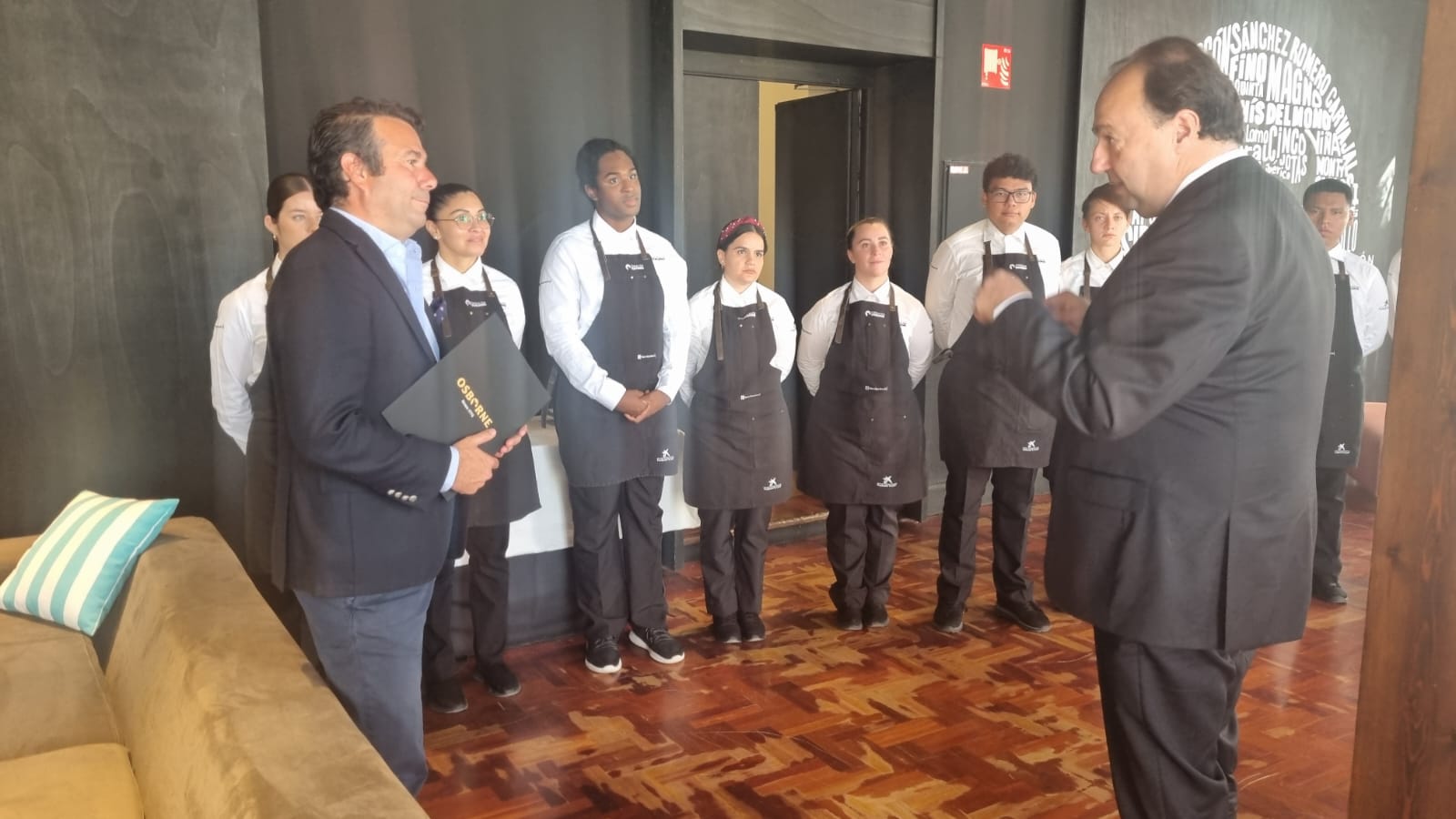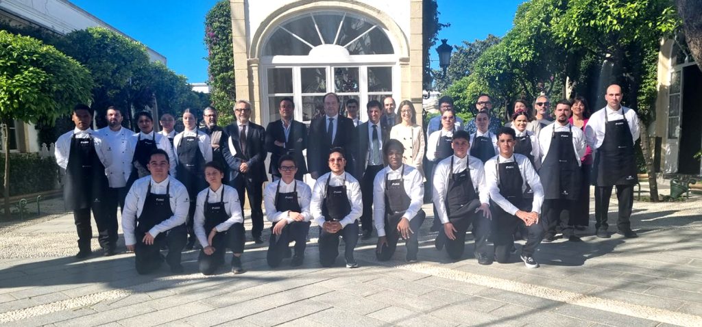 La Fundación Osborne, en estrecha colaboración con Nuevo Hogar Betania, ha alcanzado un acuerdo con la Fundación Universidad de Cádiz (FundUca) de la Universidad de Cádiz para la creación de un Título de Experto Universitario dirigido a los estudiantes de la Escuela Gastro de la propia Fundación Osborne. El rector de la Universidad de Cádiz, Casimiro Mantell, y el director de la Fundación Osborne, Iván Llanza, acompañados por el decano de la Facultad de Ciencias Sociales y de la Comunicación, José Antonio López, han visitado al alumnado en la Fundación.