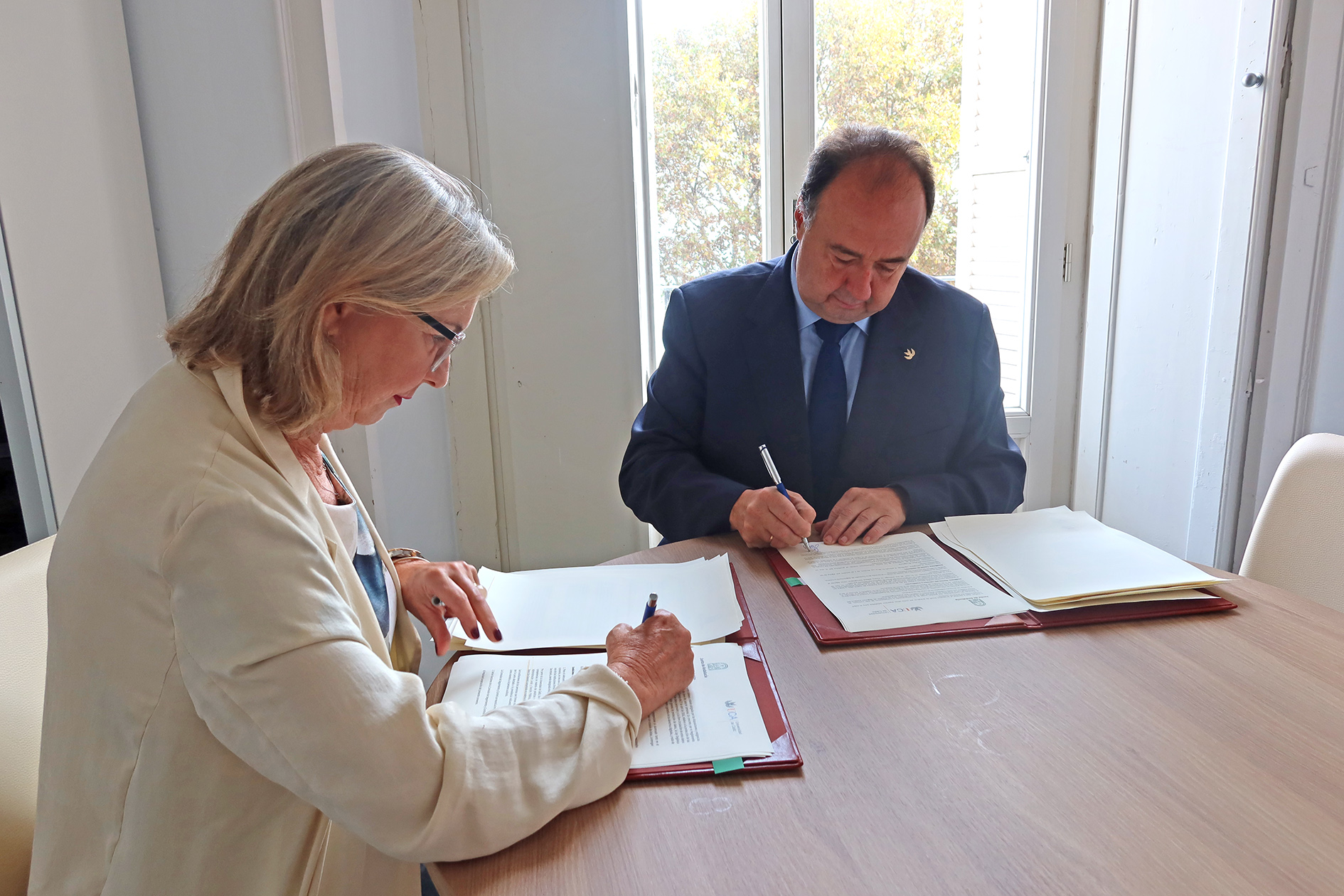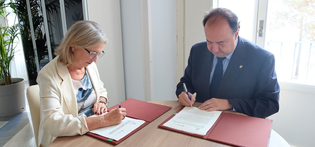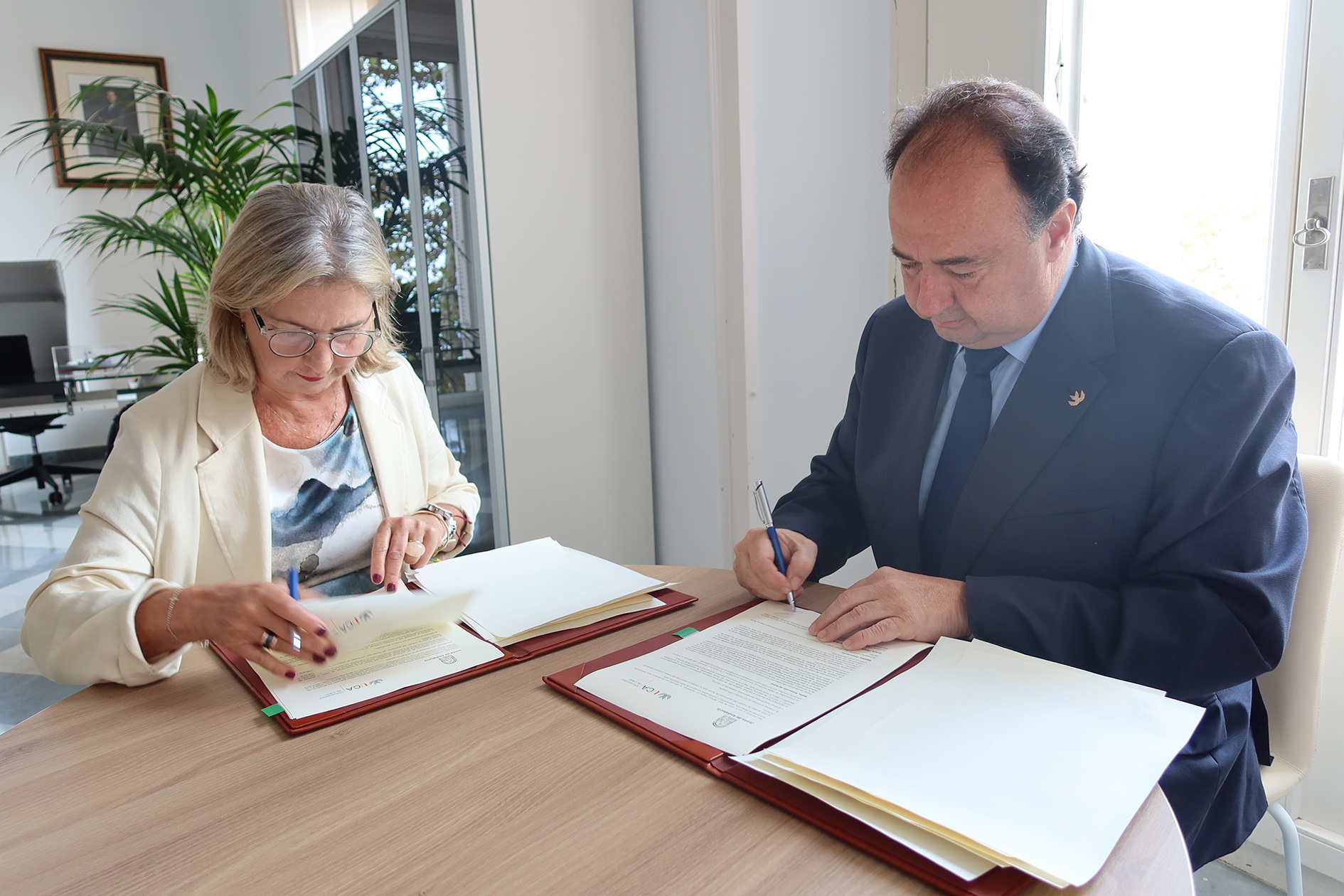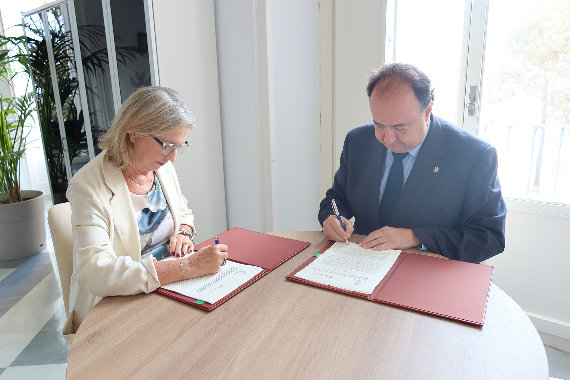 El rector de la Universidad de Cádiz, Casimiro Mantell, y la delegada territorial de Justicia, Administración Local y Función Pública de la Junta de Andalucía en Cádiz, Ana Bertón, han firmado hoy, en el Rectorado, dos convenios de cooperación educativa para la realización de prácticas externas del alumnado universitario en centros y servicios de Justicia en la provincia.