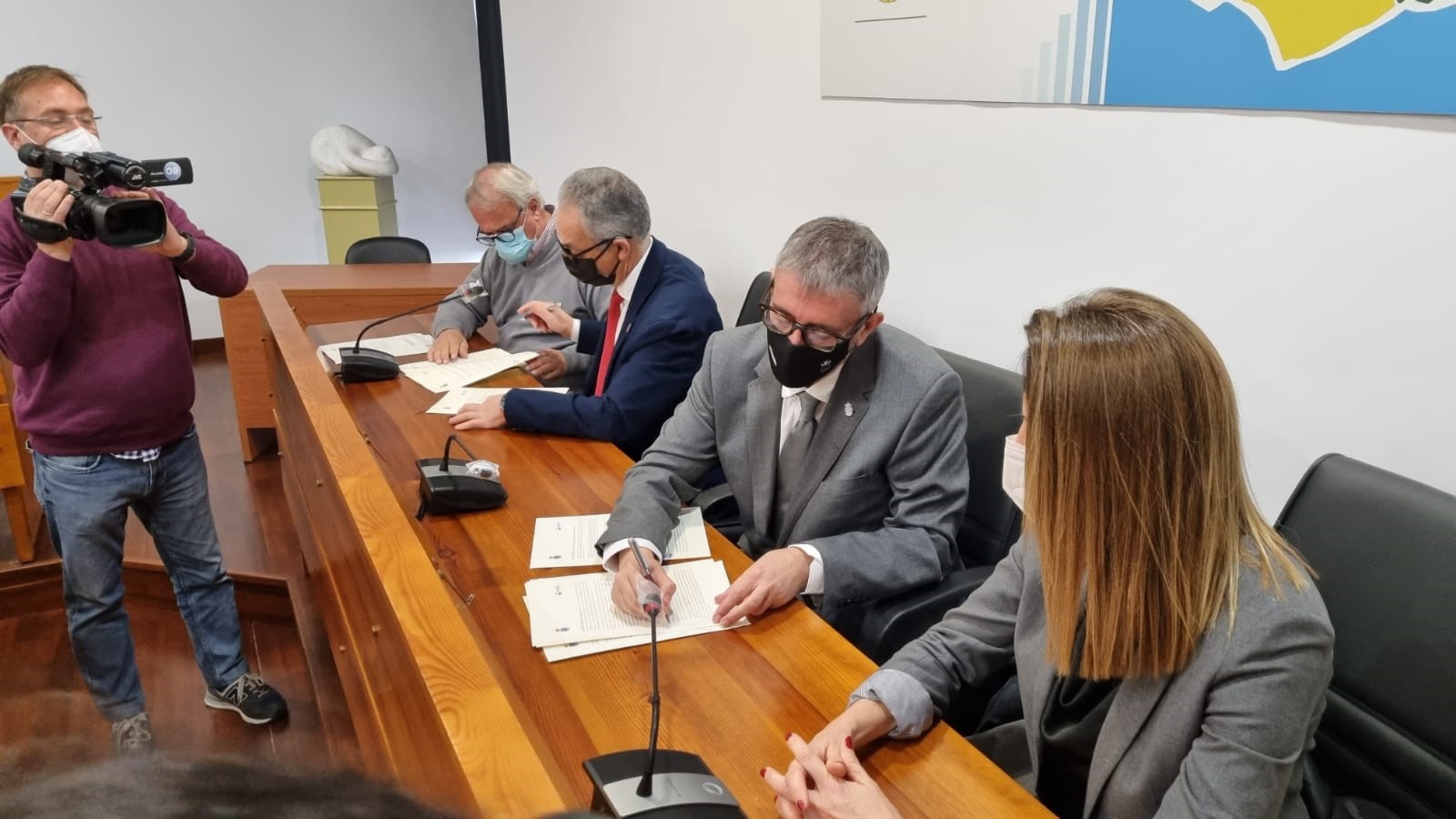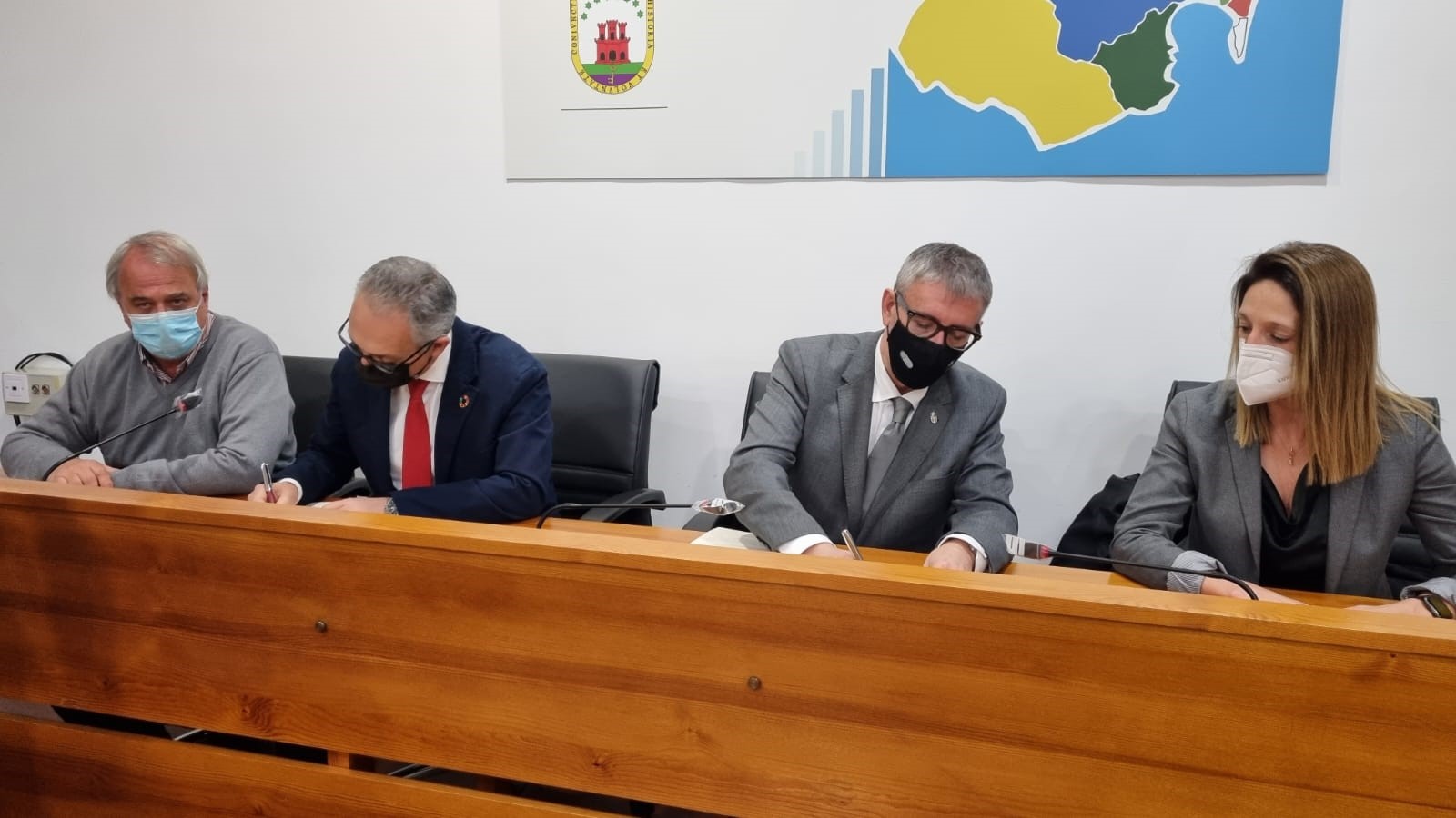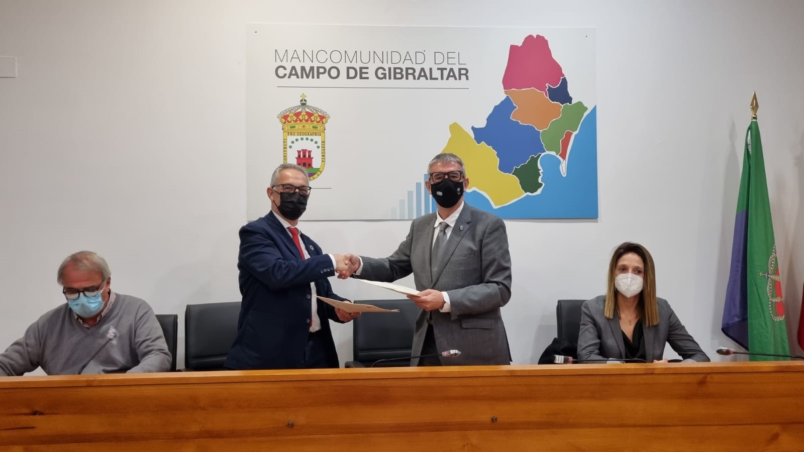 El rector de la Universidad de Cádiz, Francisco Piniella, y el presidente de la Mancomunidad de Municipios del Campo de Gibraltar, Juan Lozano, han firmado hoy, en la sede de la Mancomunidad, un convenio específico para la creación de la Cátedra externa ARCGISA de la UCA. Les han acompañado la vicerrectora del Campus Bahía de Algeciras, Mª del Mar Cerbán, el director General de la empresa pública Agua y Residuos del Campo de Gibraltar ARCGISA, José M. Alcántara.