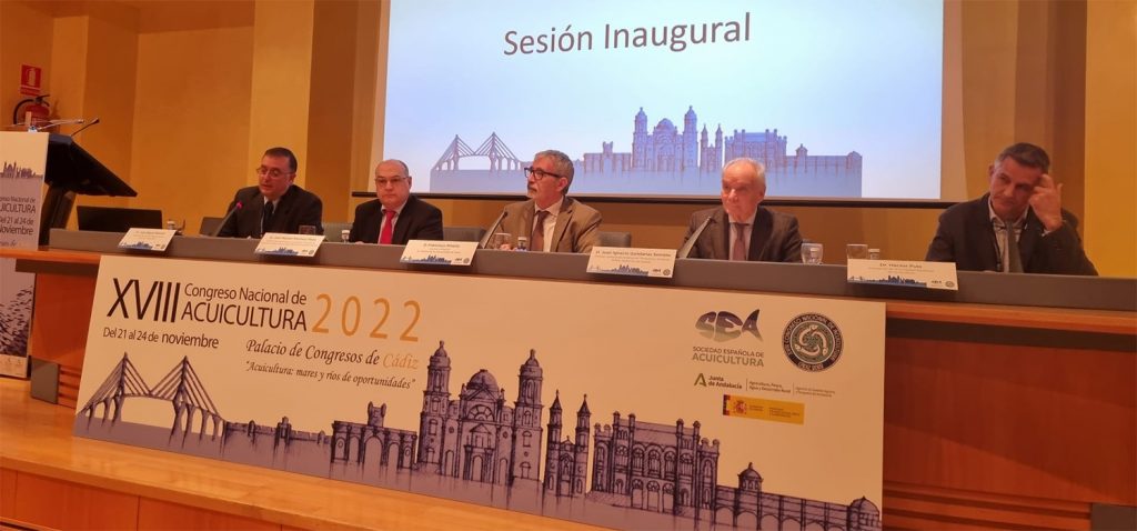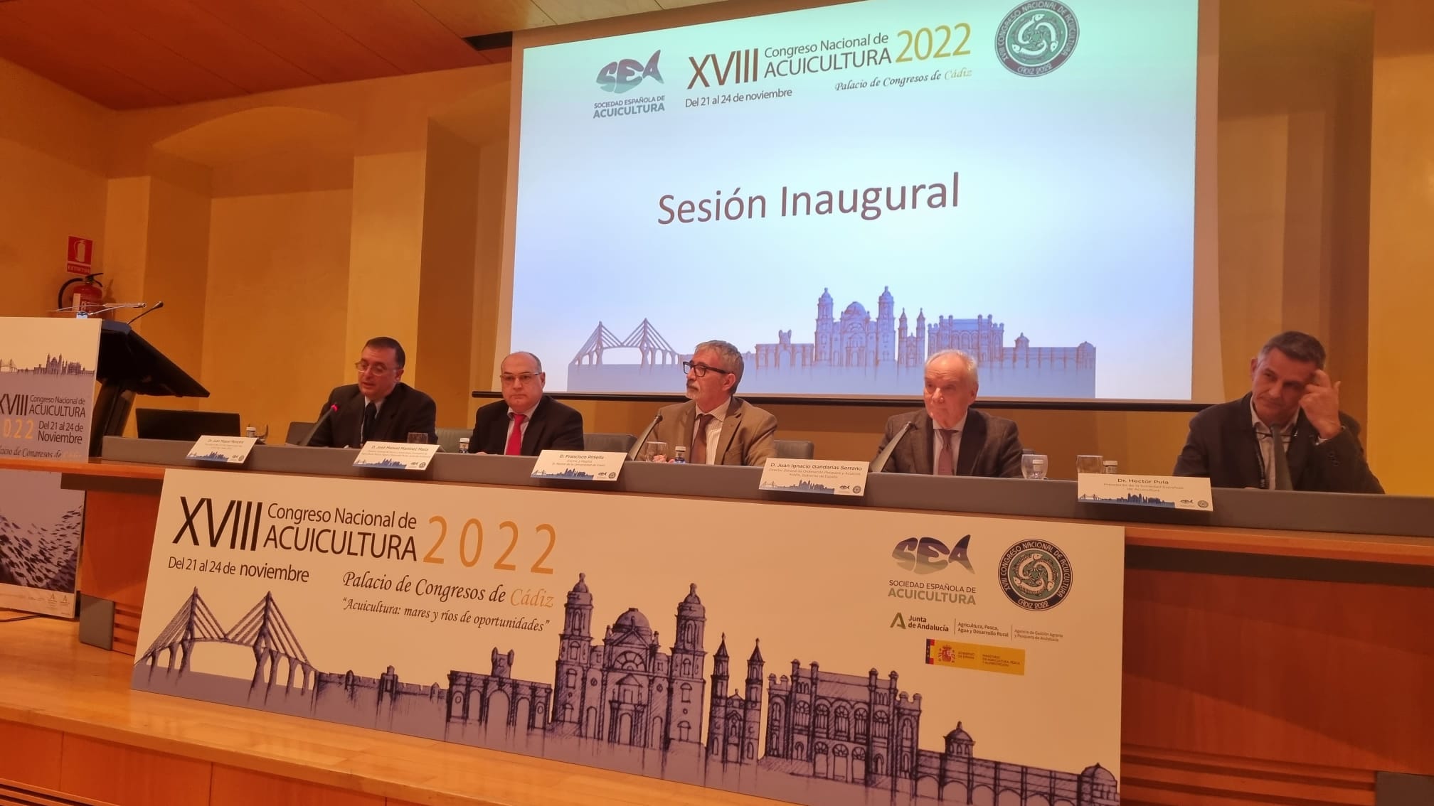 La Universidad de Cádiz y la Sociedad Española de Acuicultura (SEA) coorganizan el XVIII Congreso Nacional de Acuicultura que se celebra en Cádiz del 21 al 24 de noviembre. 300 personas, entre investigadores, alumnado, profesionales, empresas y administraciones, asisten a este encuentro científico en el Palacio de Congresos de Cádiz. El rector de la UCA, Francisco Piniella, junto al presidente de la SEA, Héctor Pula, el director General de Ordenación Pesquera y Acuícola del Ministerio de Agricultura, Pesca y Alimentación, Juan Ignacio Gandarias, el director General de Pesca y Acuicultura de la Junta de Andalucía, José Manuel Martínez, y el presidente del Comité Organizador, Juan Miguel Mancera, les han dado la bienvenida.