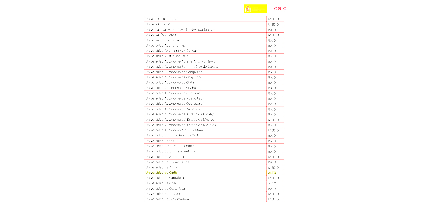 El Centro Superior de Investigaciones Científicas ha presentado el resultado de un estudio realizado sobre 6.681 editoriales, en el que el Sello Editorial UCA ha sido puntuado con valor Alto junto con otras 1.078, frente a 1.682 con valor Medio y 3.921 con valor Bajo.