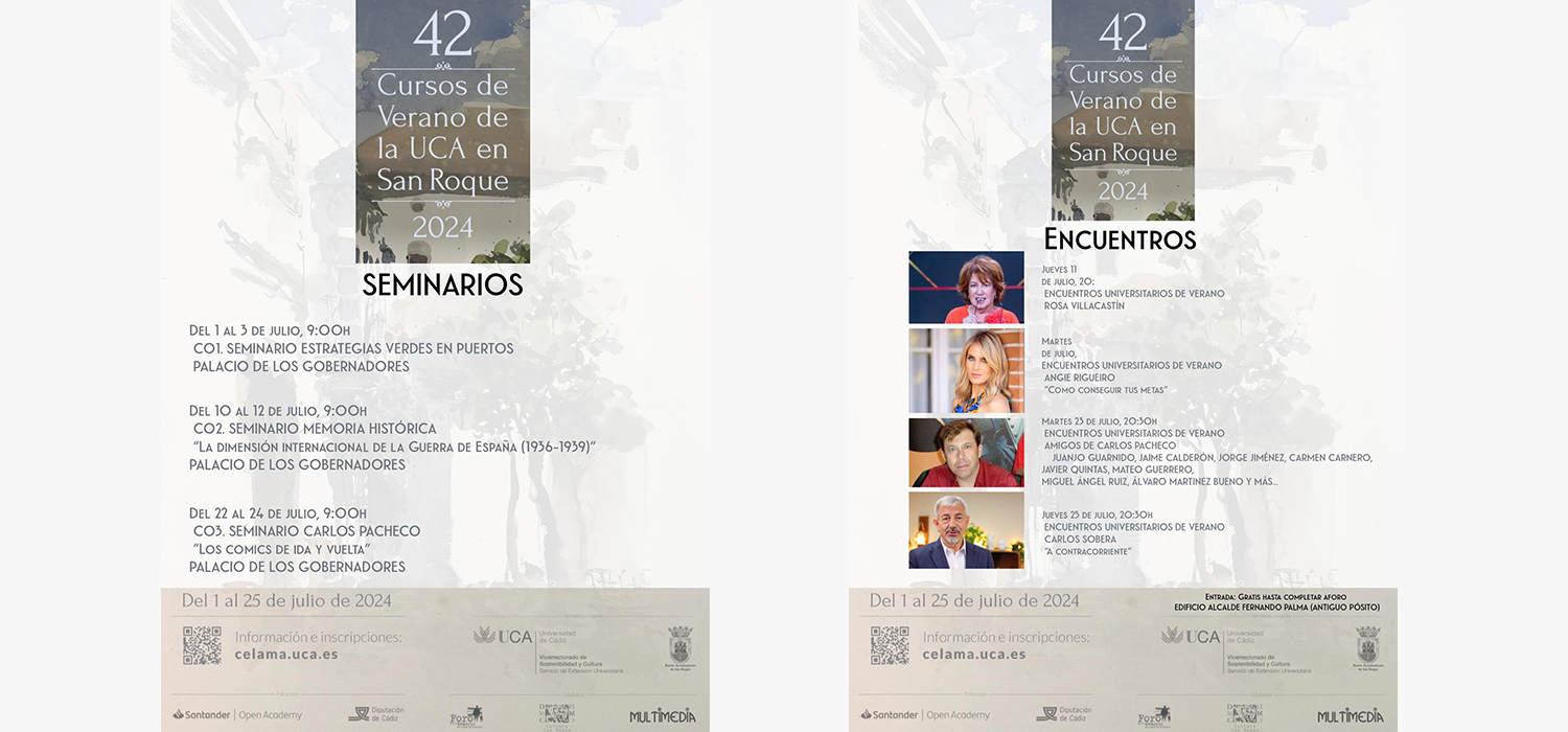 Memoria histórica, cómics y estrategias verdes serán las temáticas principales de los tres seminarios de la programación de la 42ª edición, que cuentan con el patrocinio de Santander Universidades. Del 1 al 3 de julio, se desarrollará el C01 titulado ‘Estrategias Verdes en puertos en el contexto internacional. El caso del Puerto de Algeciras’, con la coordinación de la profesora M.ª del Mar Cerbán; del C02 ‘La dimensión internacional de la Guerra de España (1936-1939)’, bajo la dirección del profesor de la UCA Julio Pérez Serrano y el periodista Juan Miguel León, y el C03, seminario Carlos Pacheco ‘Los cómics de ida y vuelta’, será del 22 al 24 de julio, cuyos responsables son el profesor Francisco Saéz de Adana (Universidad de Alcalá de Henares) y el autor gaditano Rafael Marín.