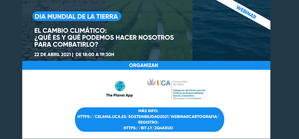 En el marco del Día Mundial de la Tierra, la Oficina para la Sostenibilidad de la Universidad de Cádiz, perteneciente a la Delegación del Rector para las Políticas de Responsabilidad Social y Corporativa, junto aThe Planet App organiza hoy, jueves 22 de abril, a las 18:00 horas, el webinar El Cambio Climático, ¿Qué es y qué podemos hacer nosotros para cambiarlo? Con una hora de duración, se celebrará a través de la plataforma Zoom.us y es necesario registrarse en: https://bit.ly/3sKZPd7