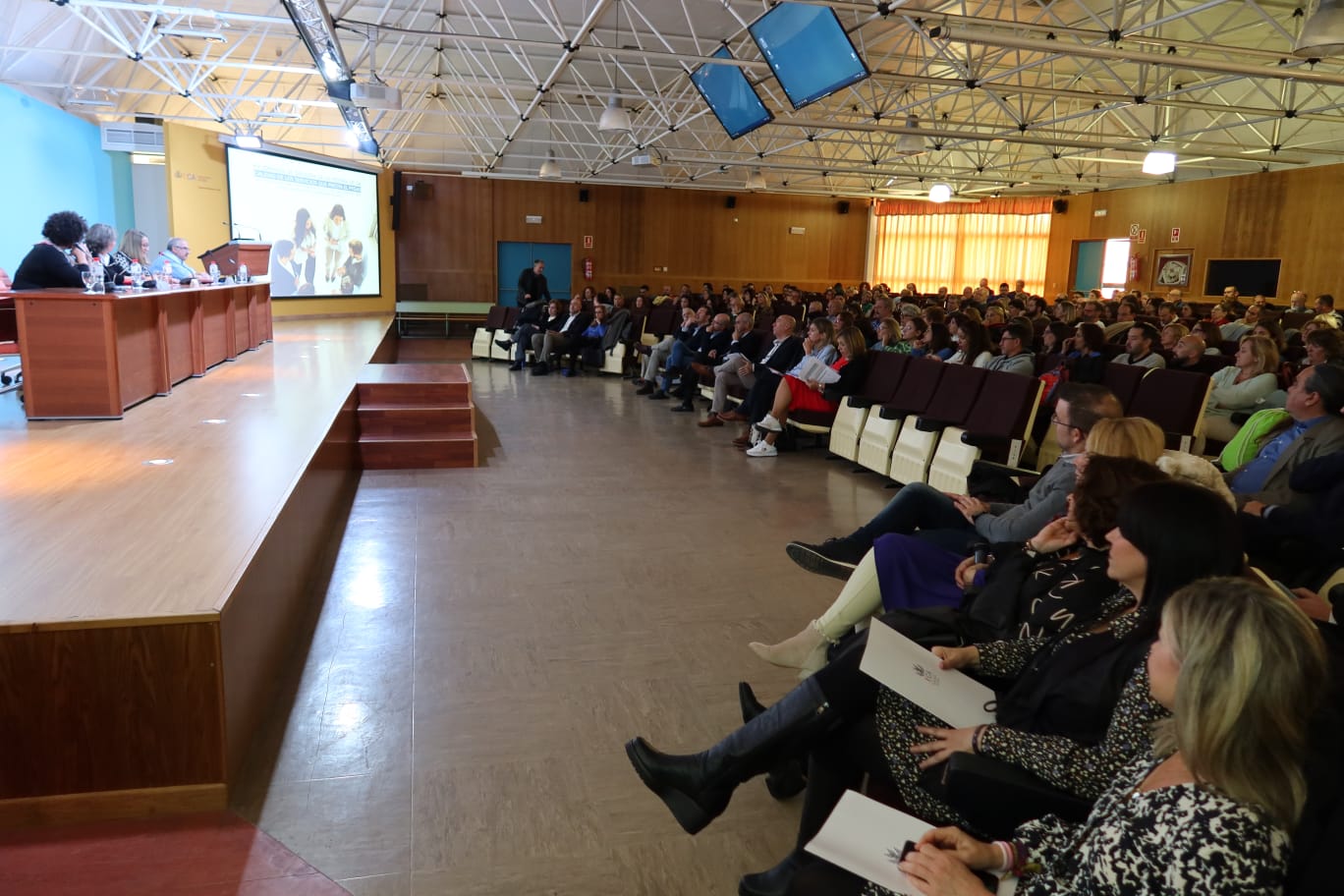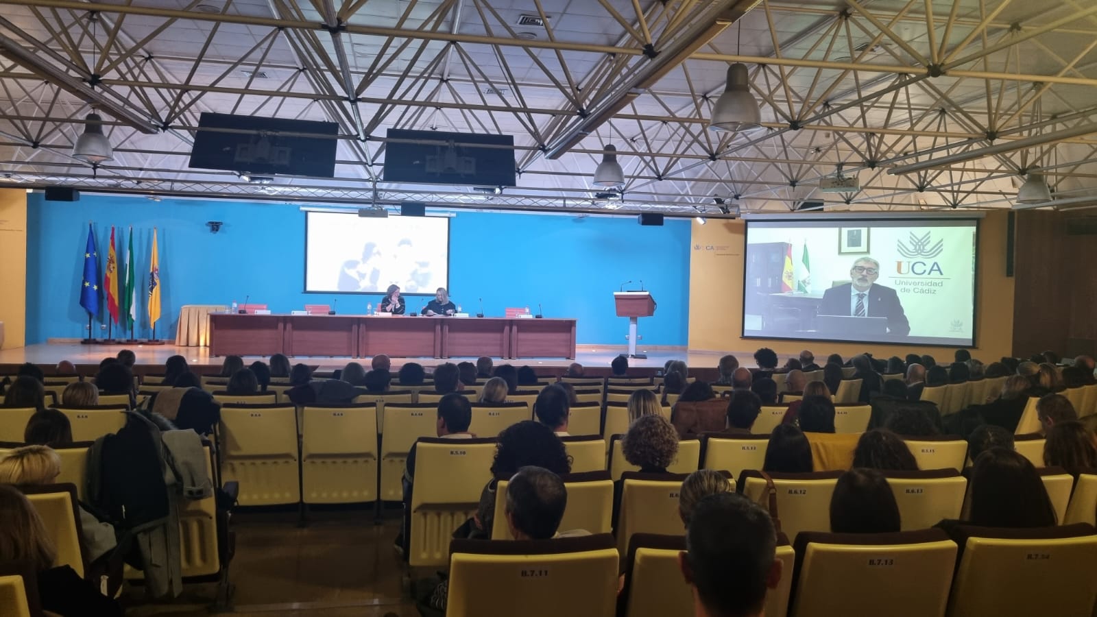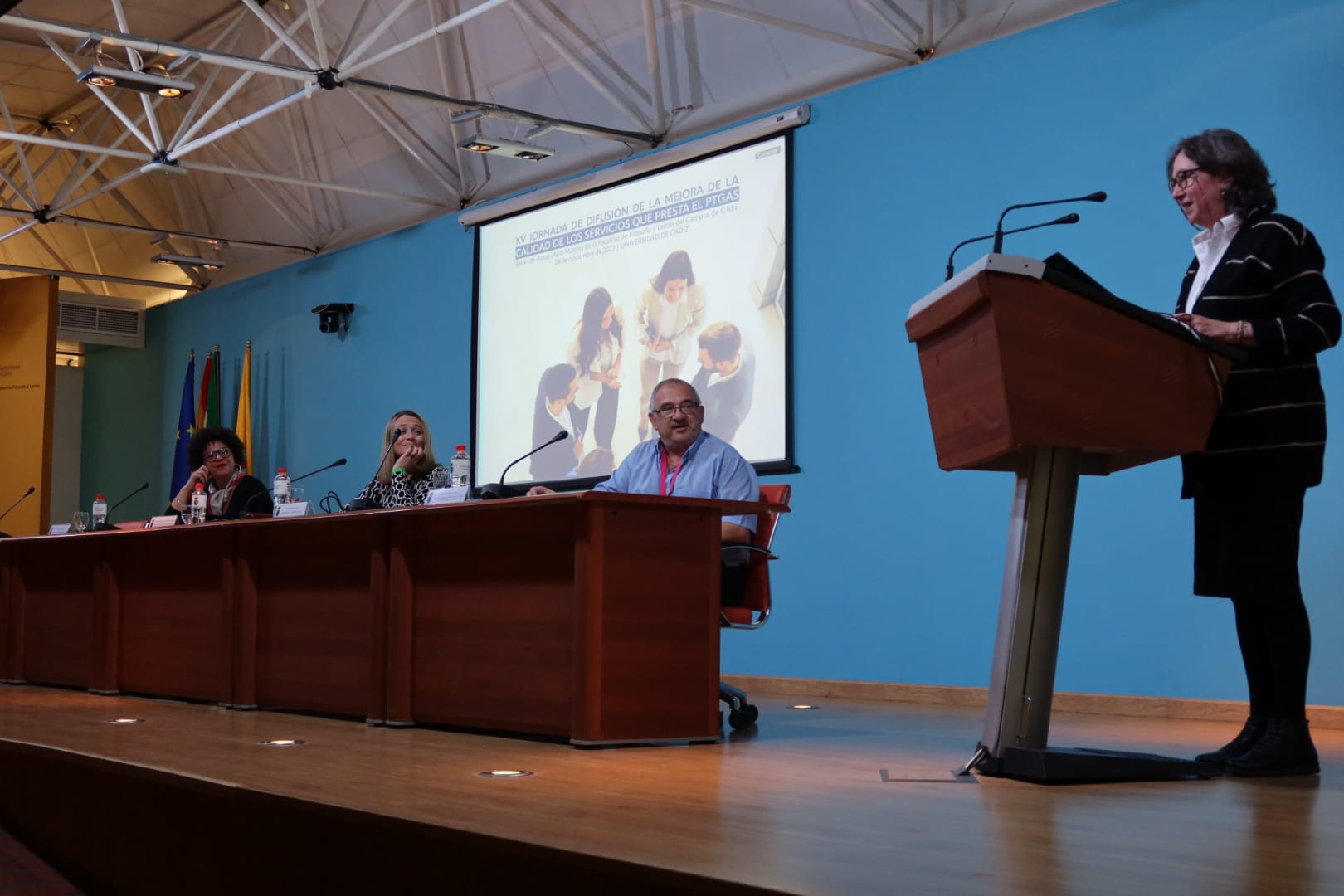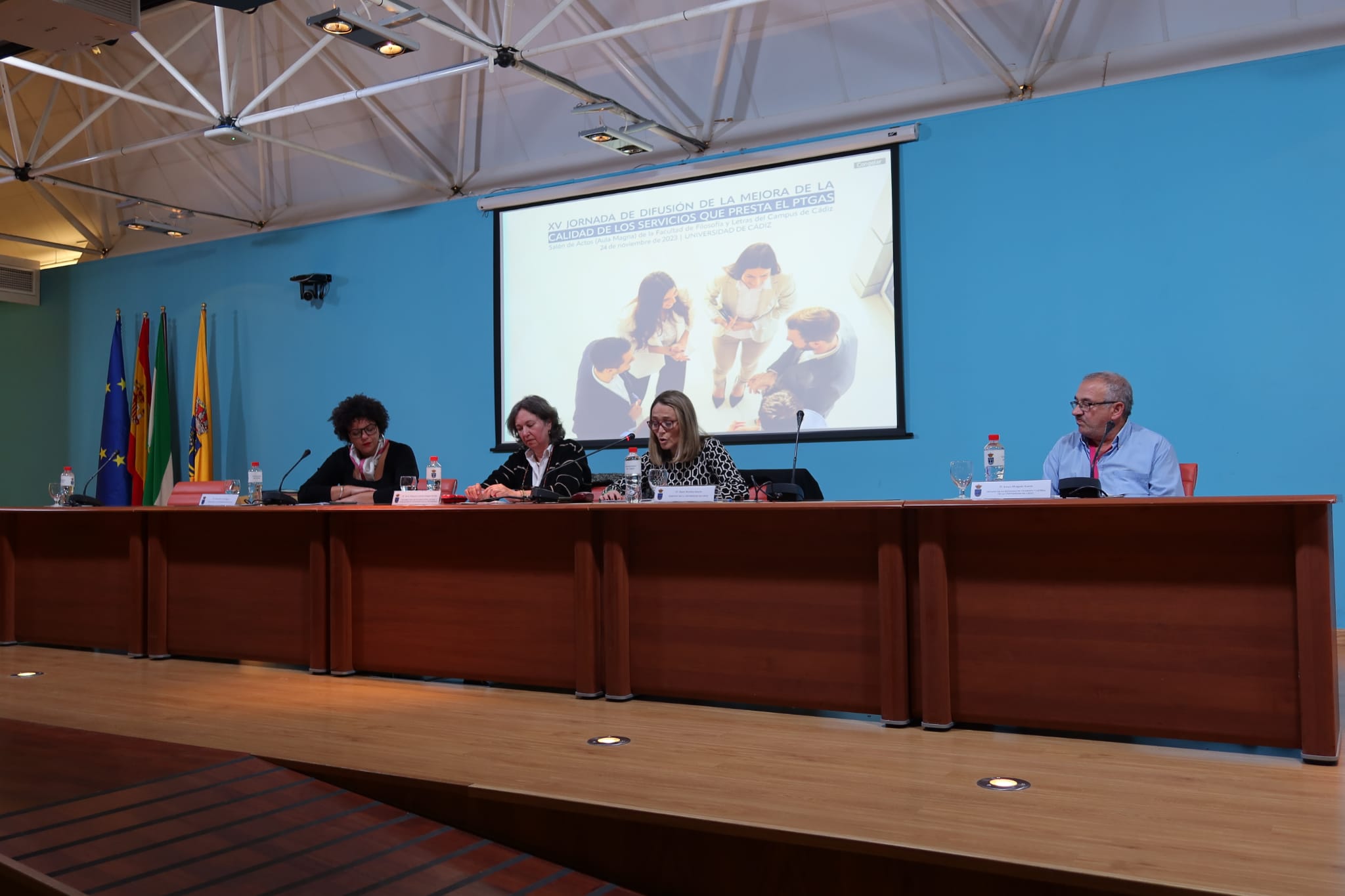 La Facultad de Filosofía y Letras ha acogido hoy, viernes 24, la XV Jornada de Difusión de la Mejora de la Calidad de los Servicios que presta el Personal Técnico y de Gestión de Administración y Servicios (PTGAS) de la Universidad de Cádiz. La gerente en funciones de la Universidad de Cádiz, Mariví Martínez, junto a la vicerrectora de Planificación, Calidad y Evaluación en funciones de la UCA, Milagrosa Casimiro-Soriguer, el decano de la Facultad de Filosofía y Letras, Arturo Morgado, y la gerente de la Universidad de Sevilla, Melania Rivers, les han dado la bienvenida en el aula Magna.